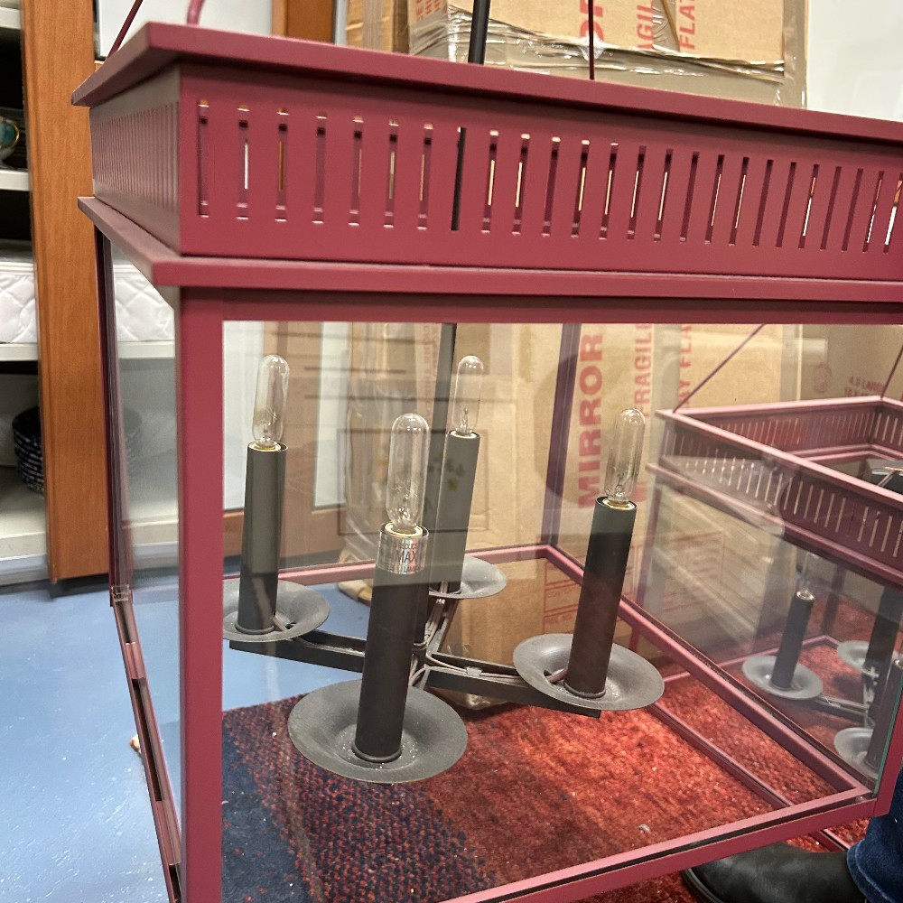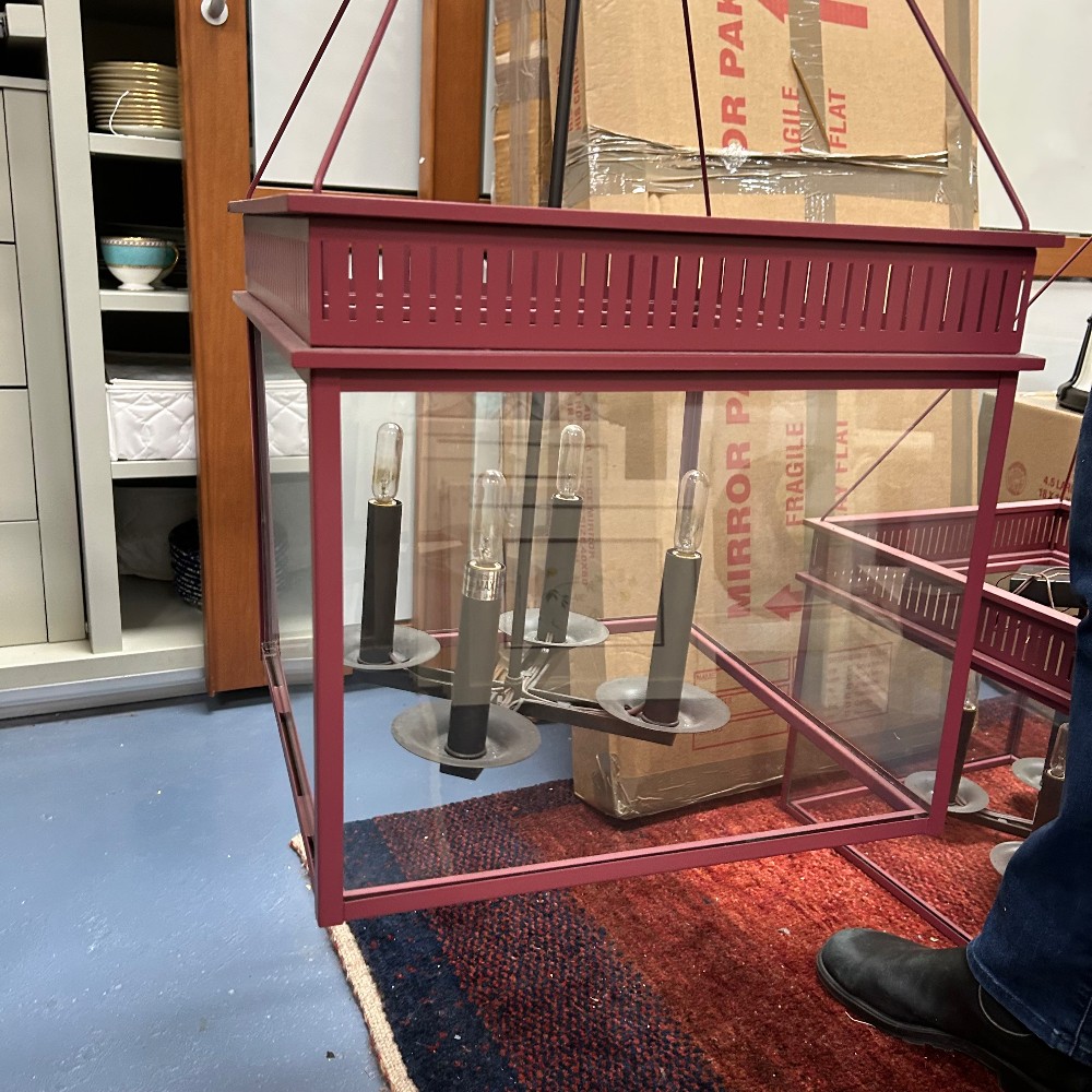 Bookish Red. Measuring 16.75"W x 32"T x 18" chain length