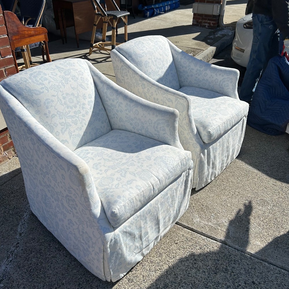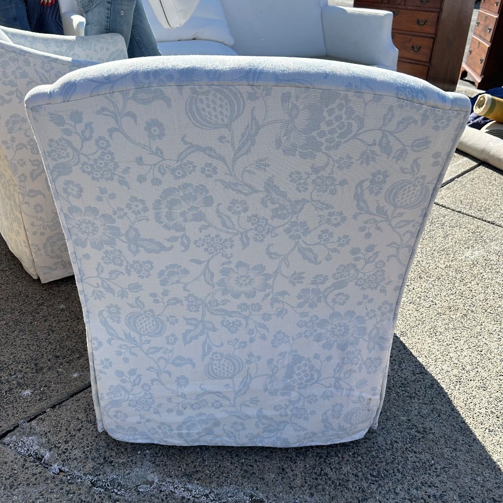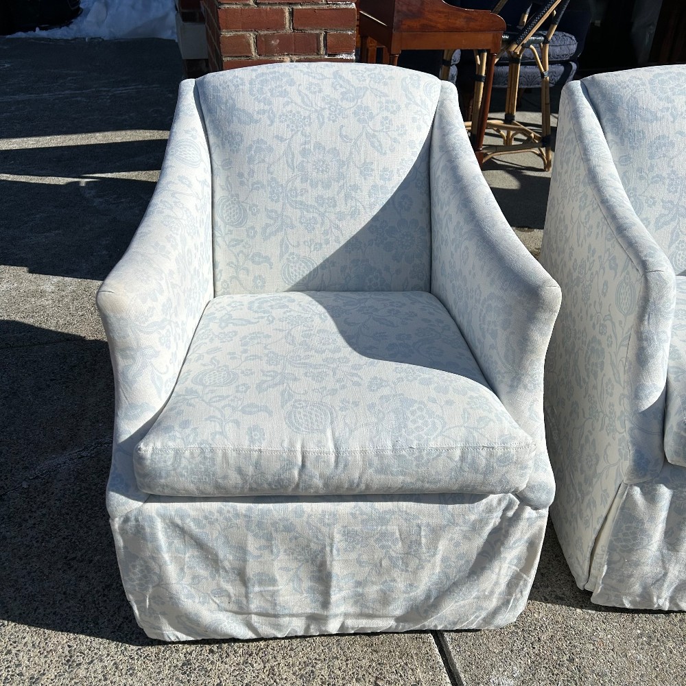 Pair of chairs. Slight discoloration on arms, as pictured. Soft blue and white floral pattern. Measuring 29"W x 34"T x 34"D x 19" seat height