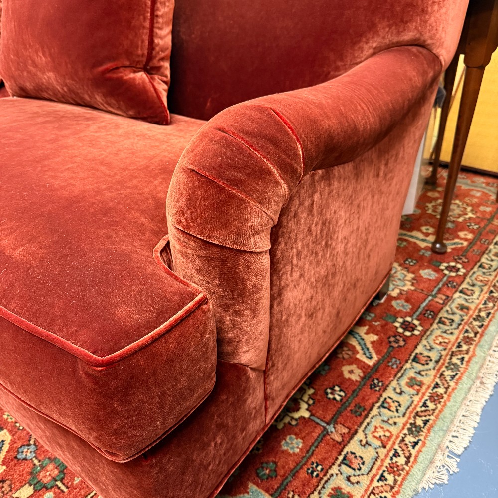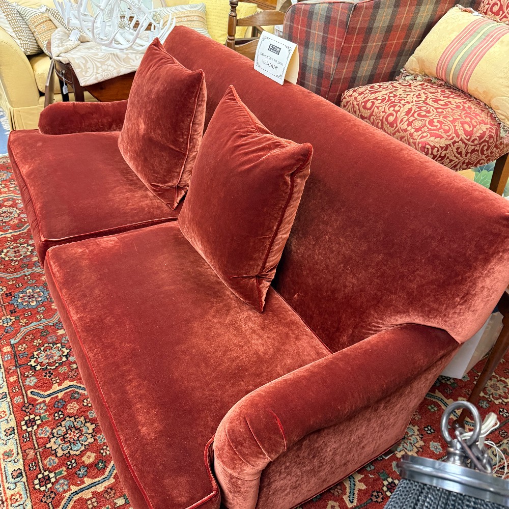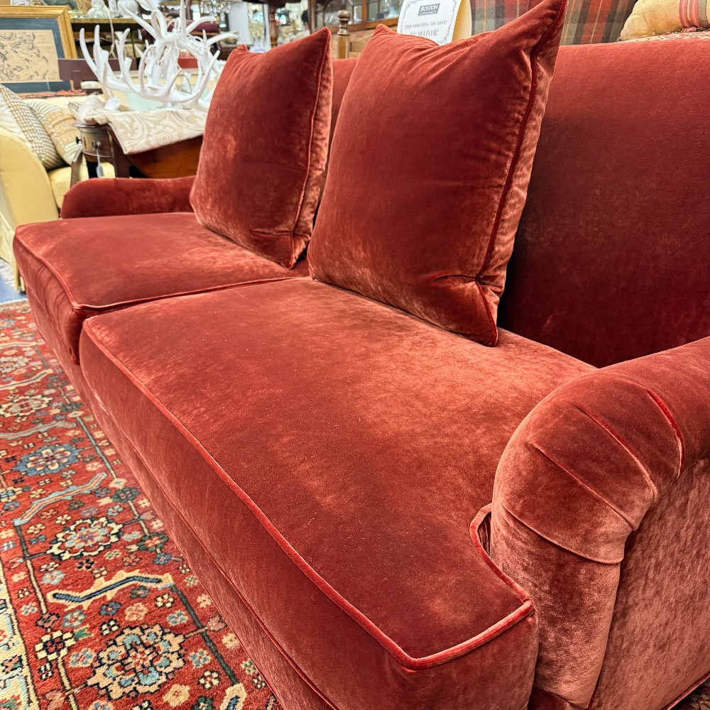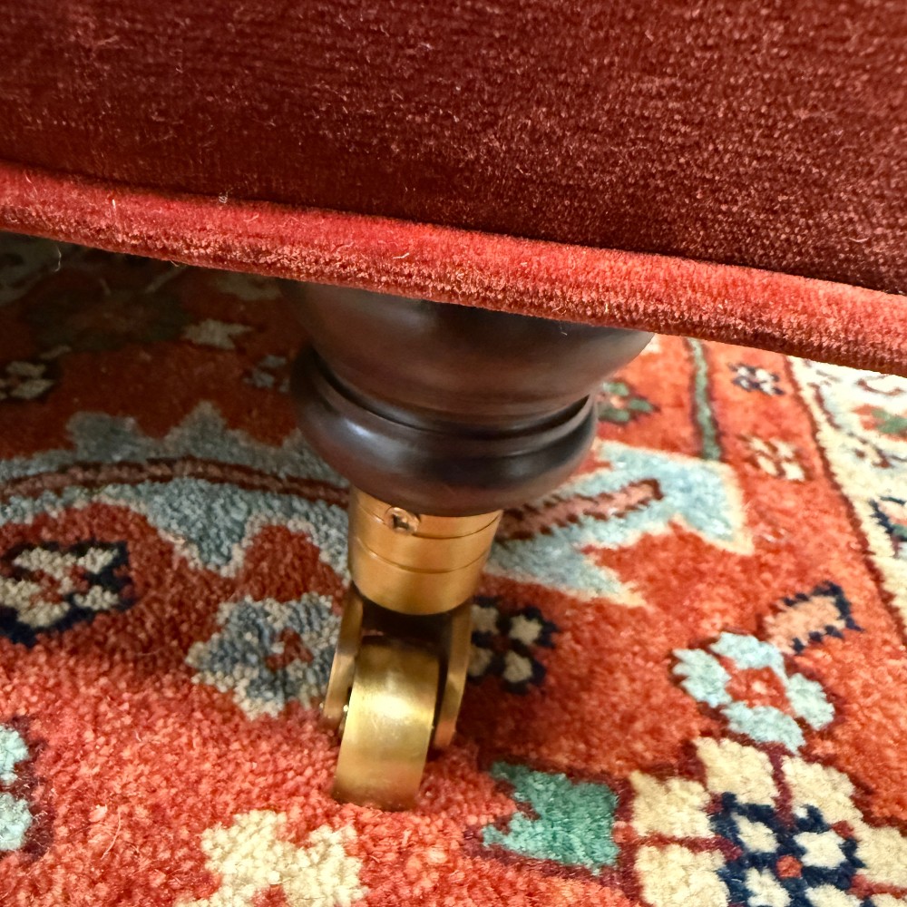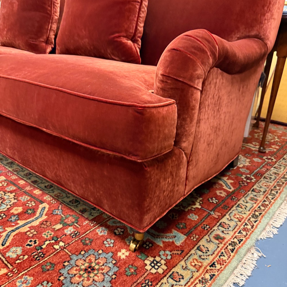 seat height 18" seat depth 24" - overall depth 39" deep, 35" h back, 23" h arm, 82" wide and brass castors / Mahogany feet