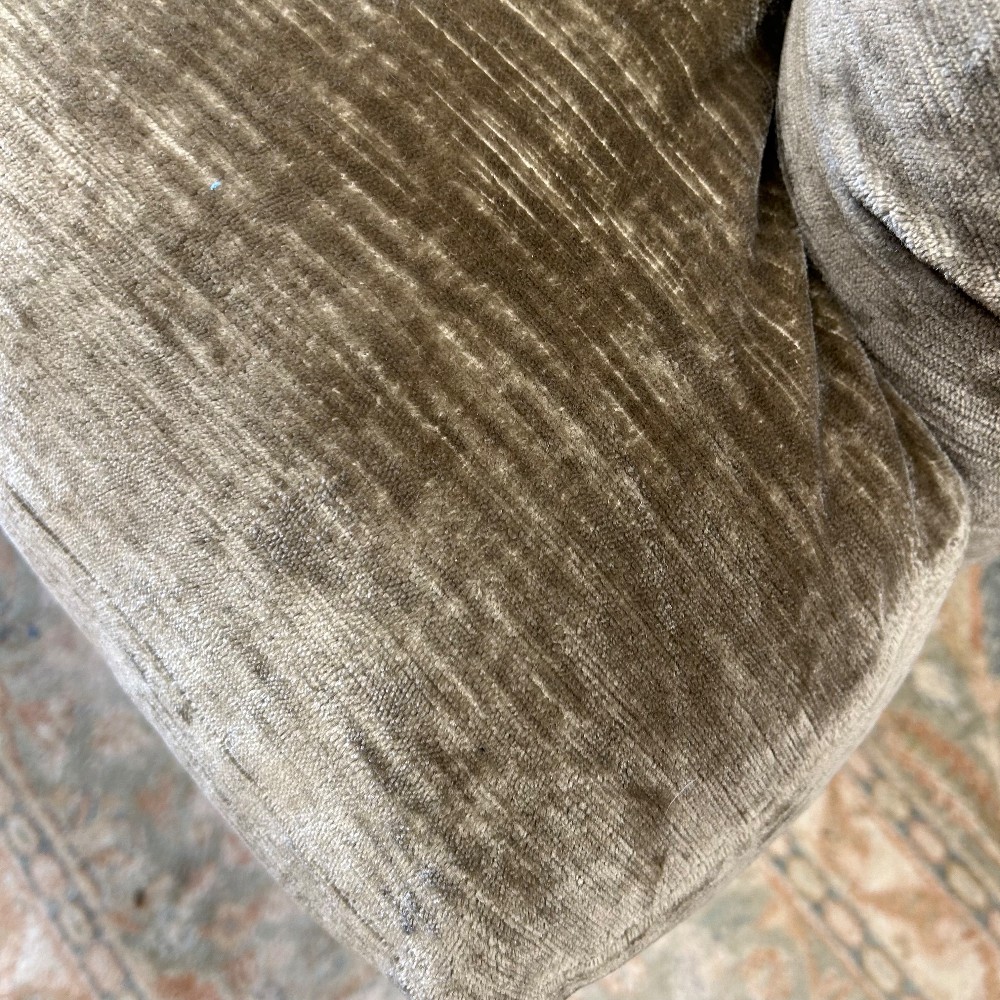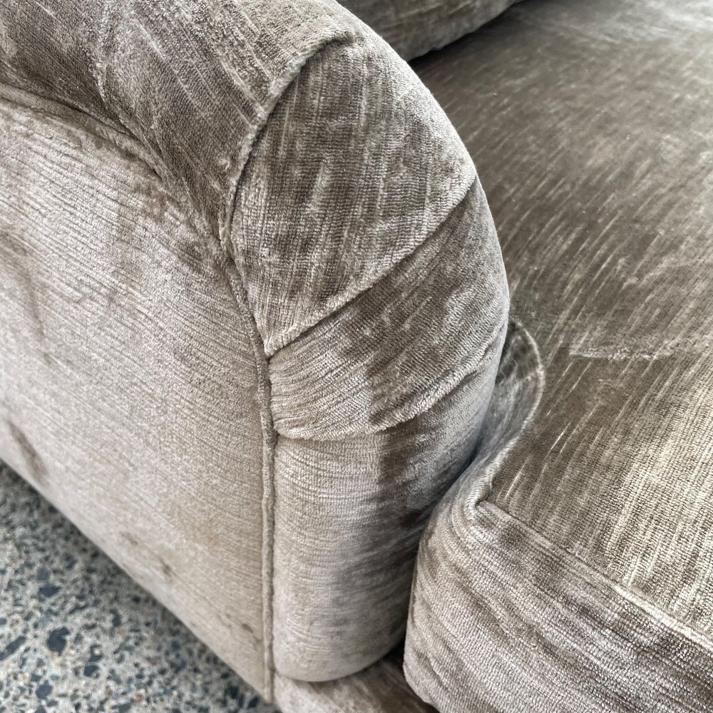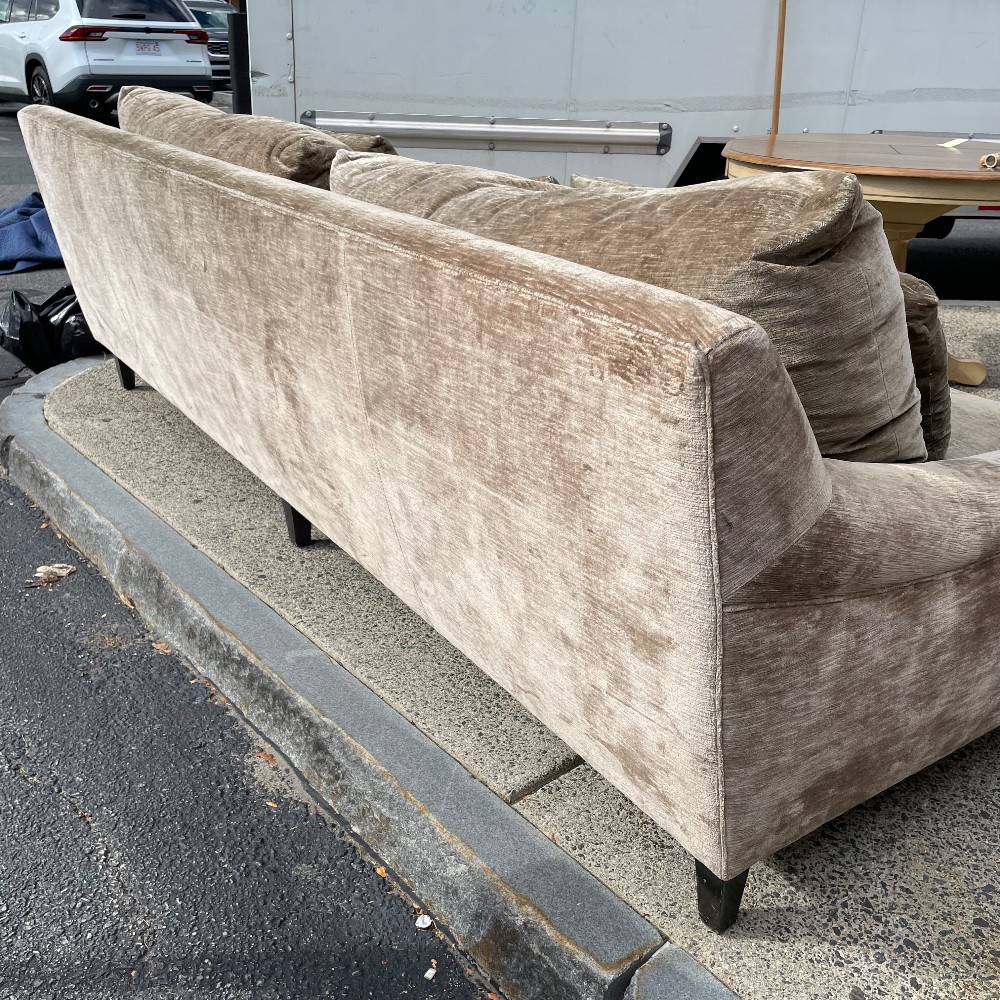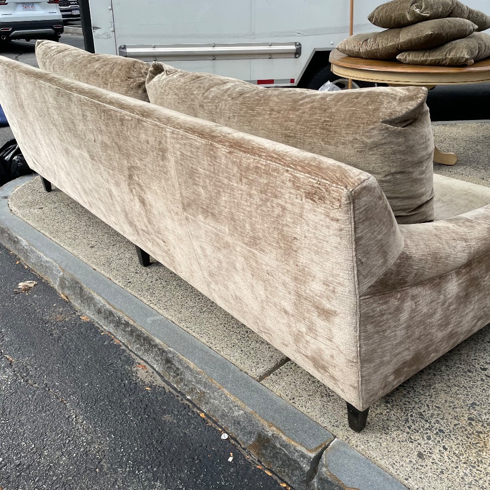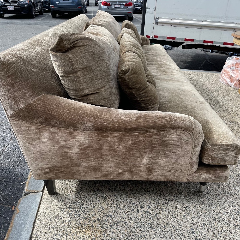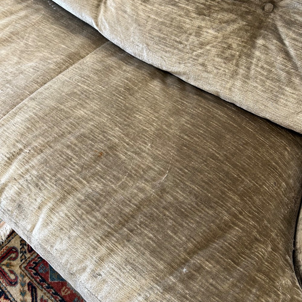 Crushed velvet taupe fabric. Measuring 49"D x 108"L x 32 1/2"T x 18" seat height, 22 1/2" arm height. Condition as pictured. Sofa structure in excellent condition w/ slight staining in spots on cusions, as pictured.