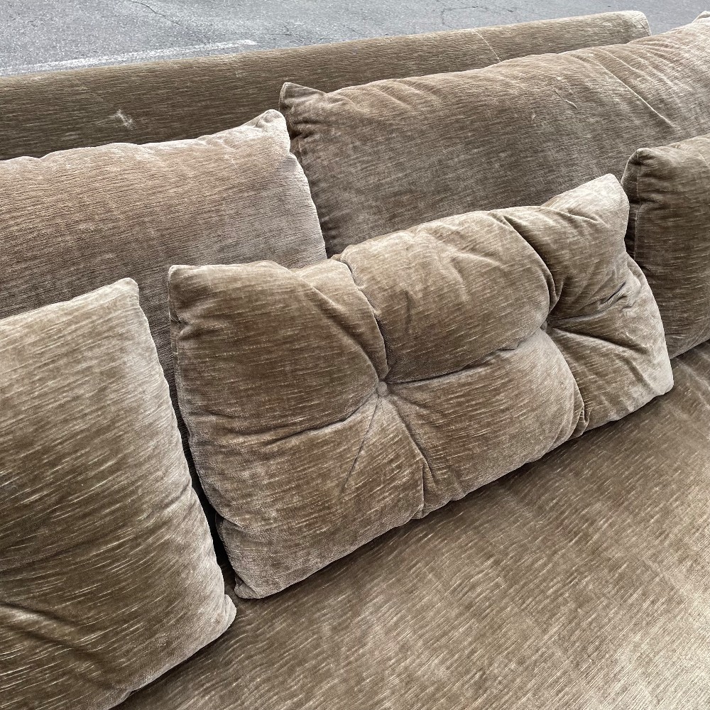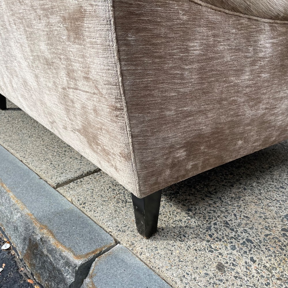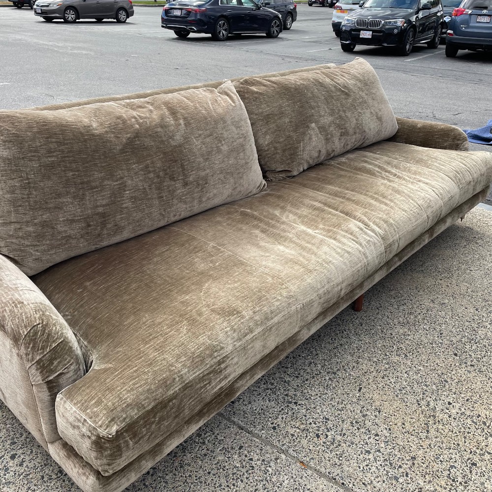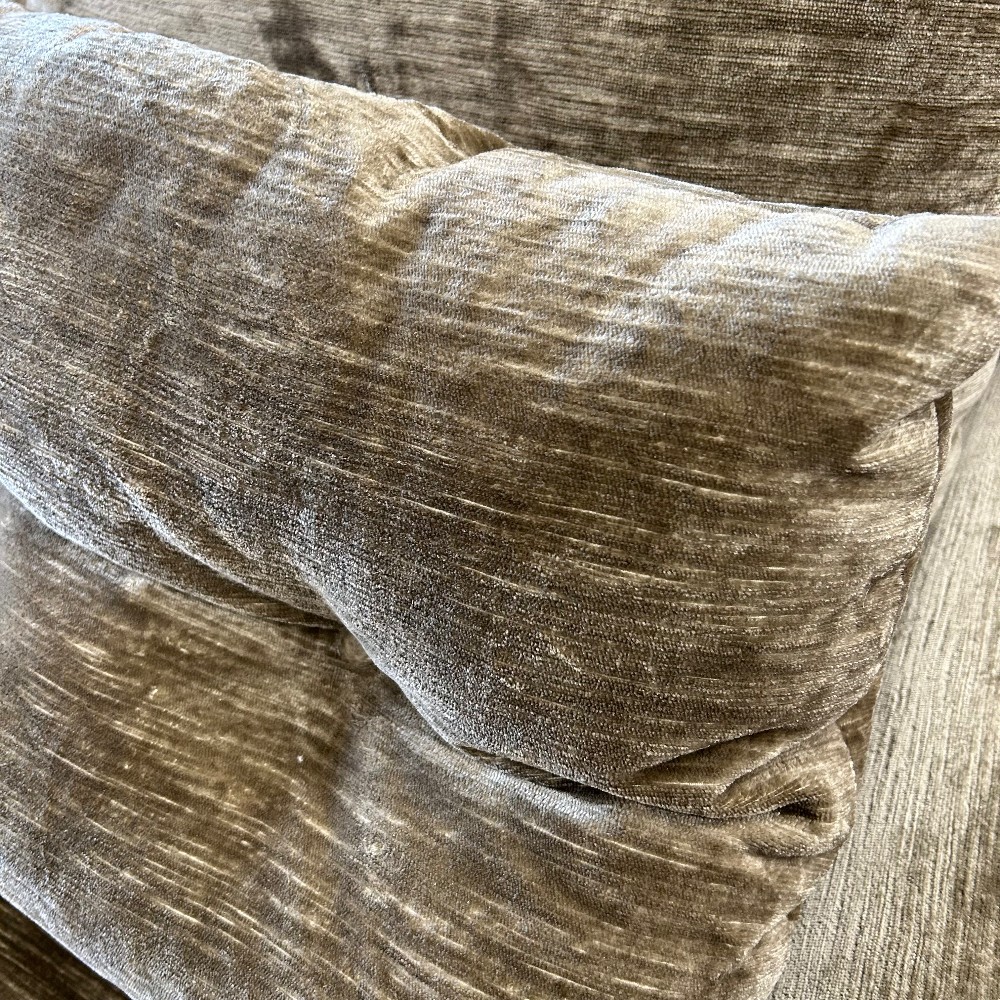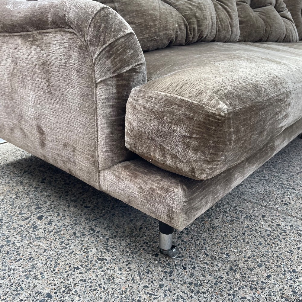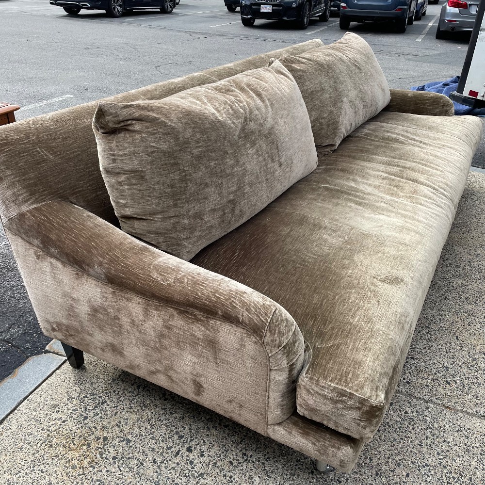 Crushed velvet taupe fabric. Measuring 49"D x 108"L x 32 1/2"T x 18" seat height, 22 1/2" arm height. Condition as pictured. Sofa structure in excellent condition w/ slight staining in spots on cusions, as pictured.