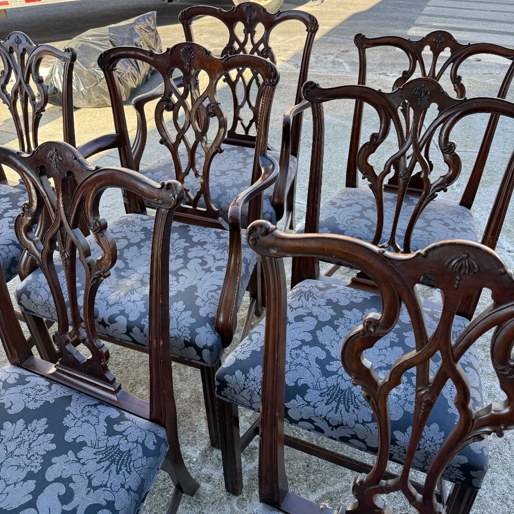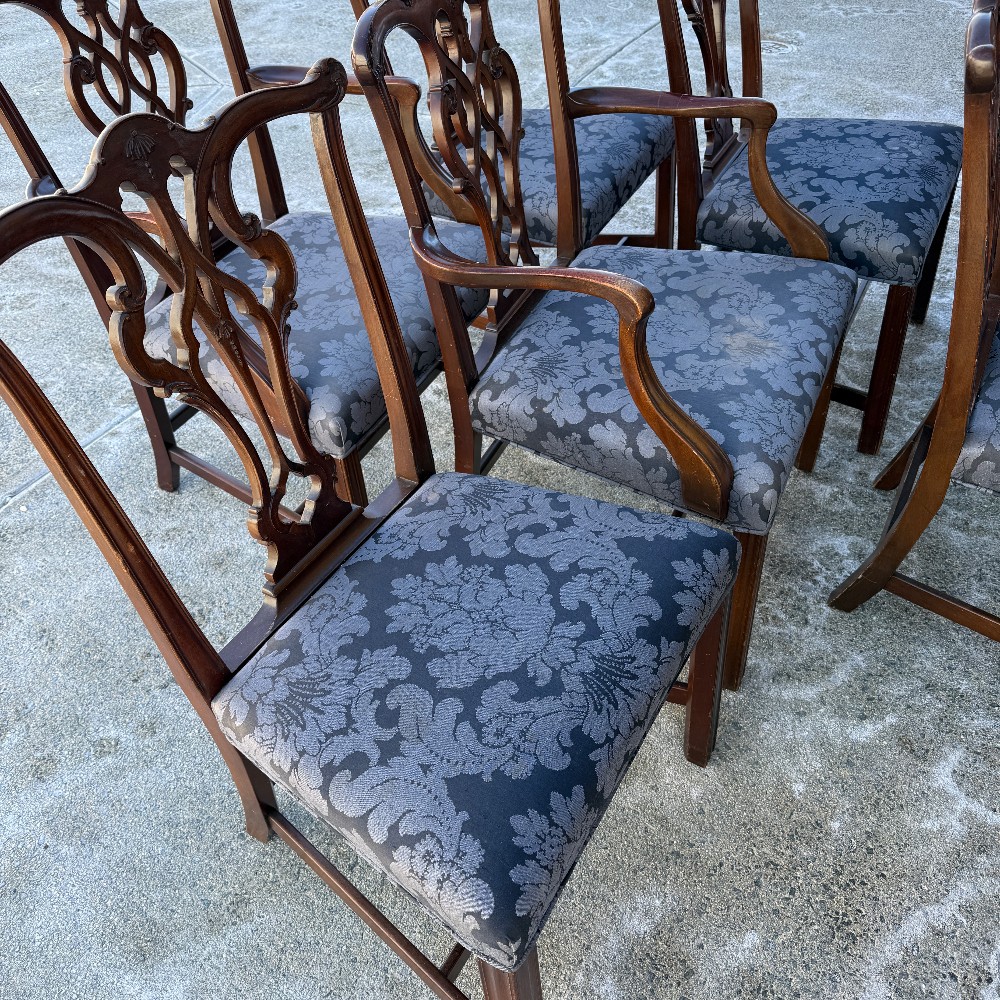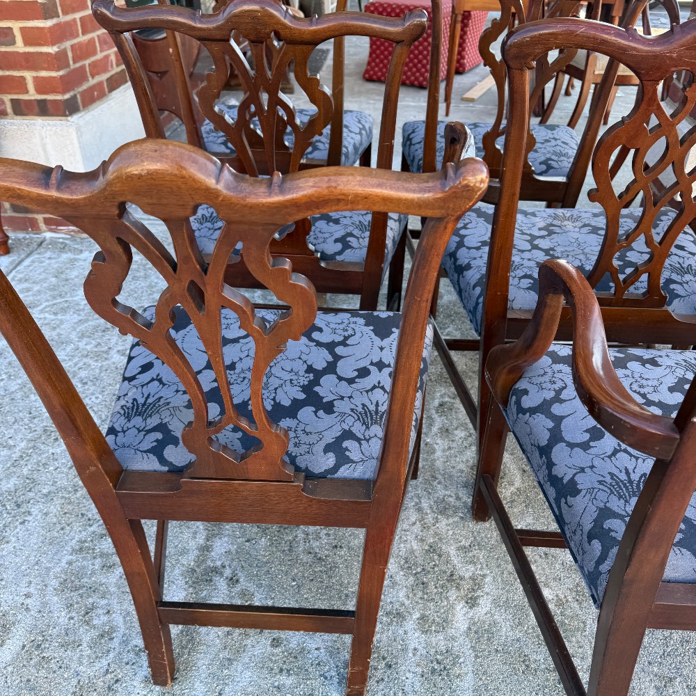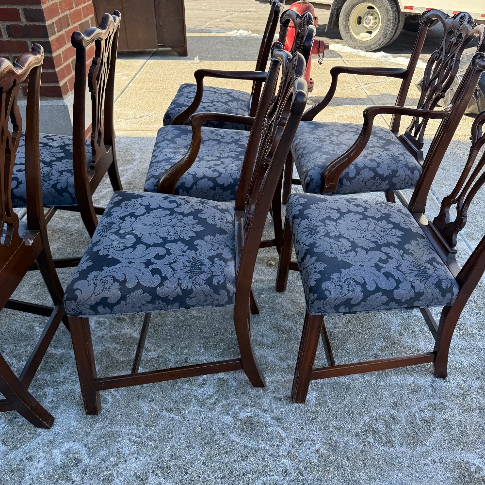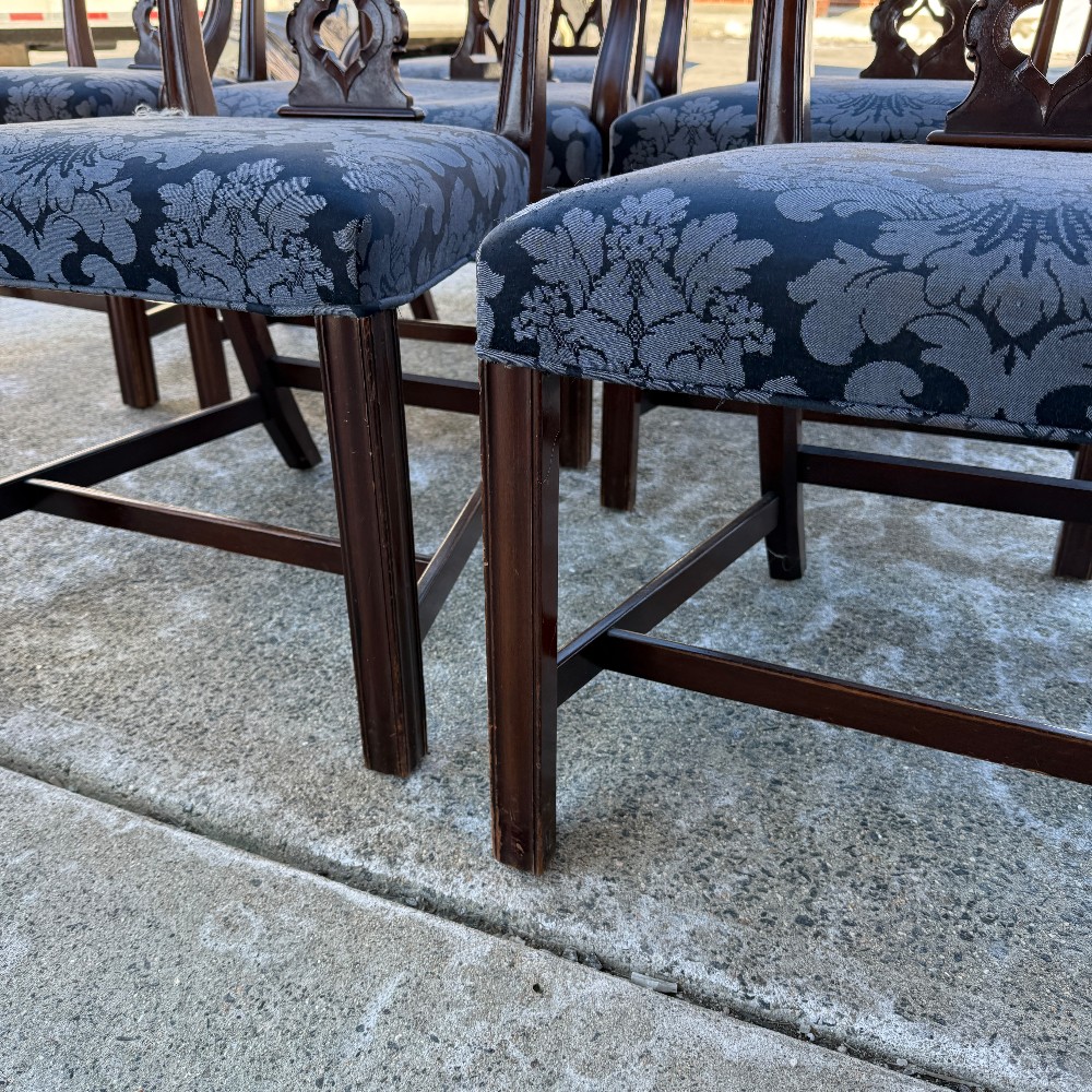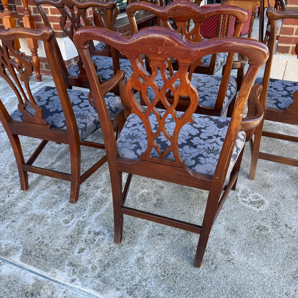 Measuring 37 1/2"T x 22"W x 21"D x 18" seat height. Blue upholstery, shows wear/stains on some chairs.