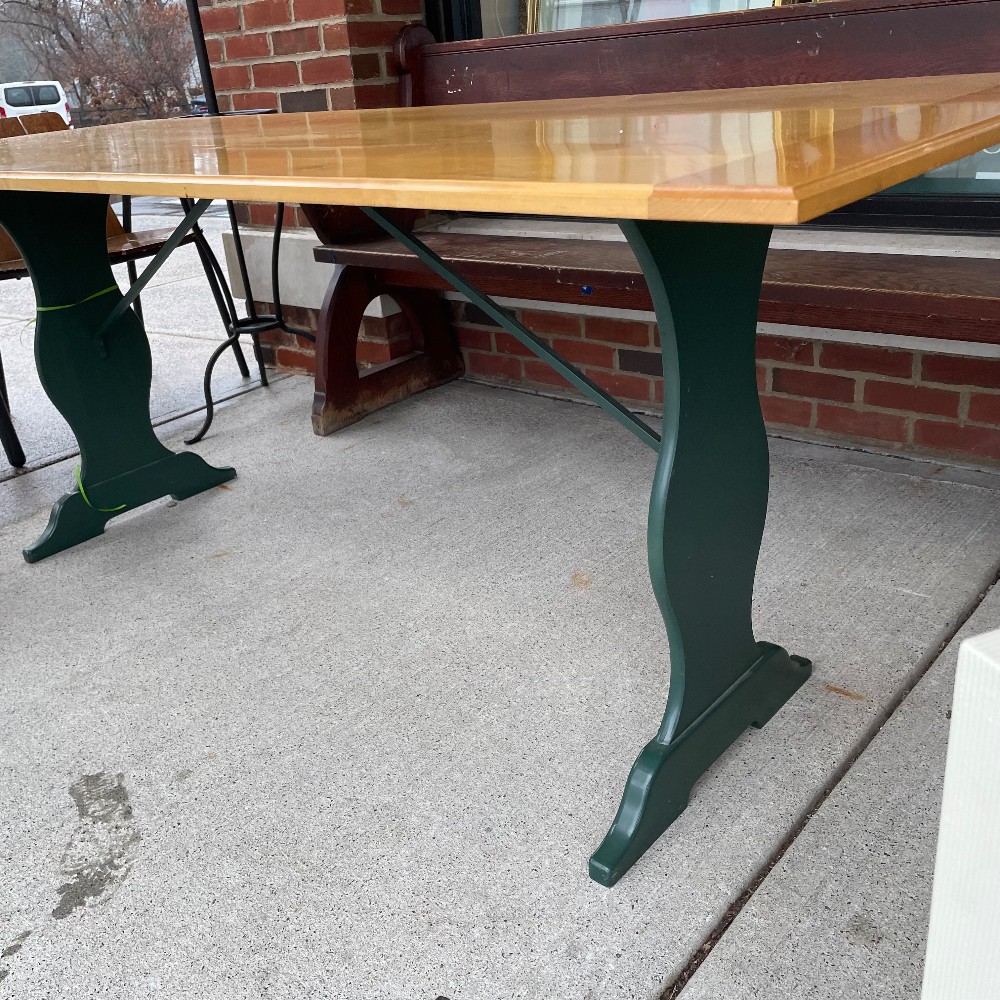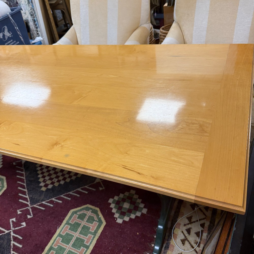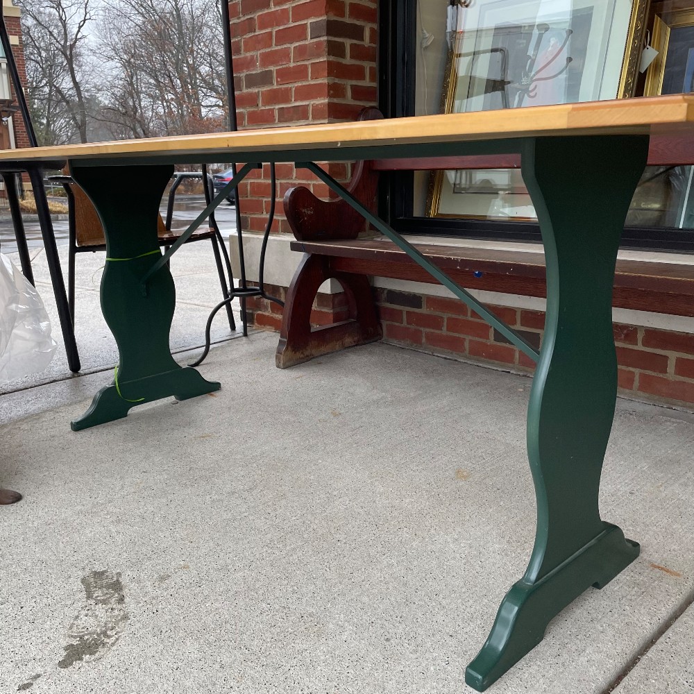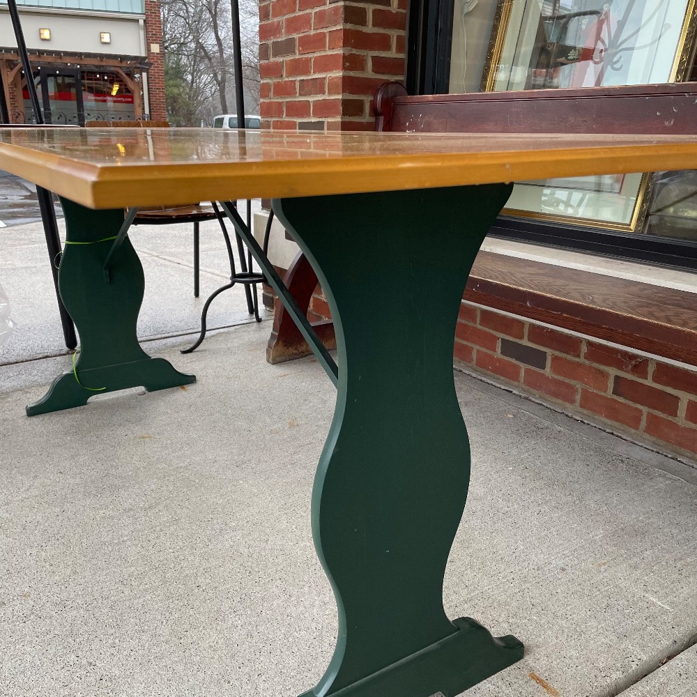 custom made, pine table with blonde top, green legs 29.75" w x 30" tall and 77" long