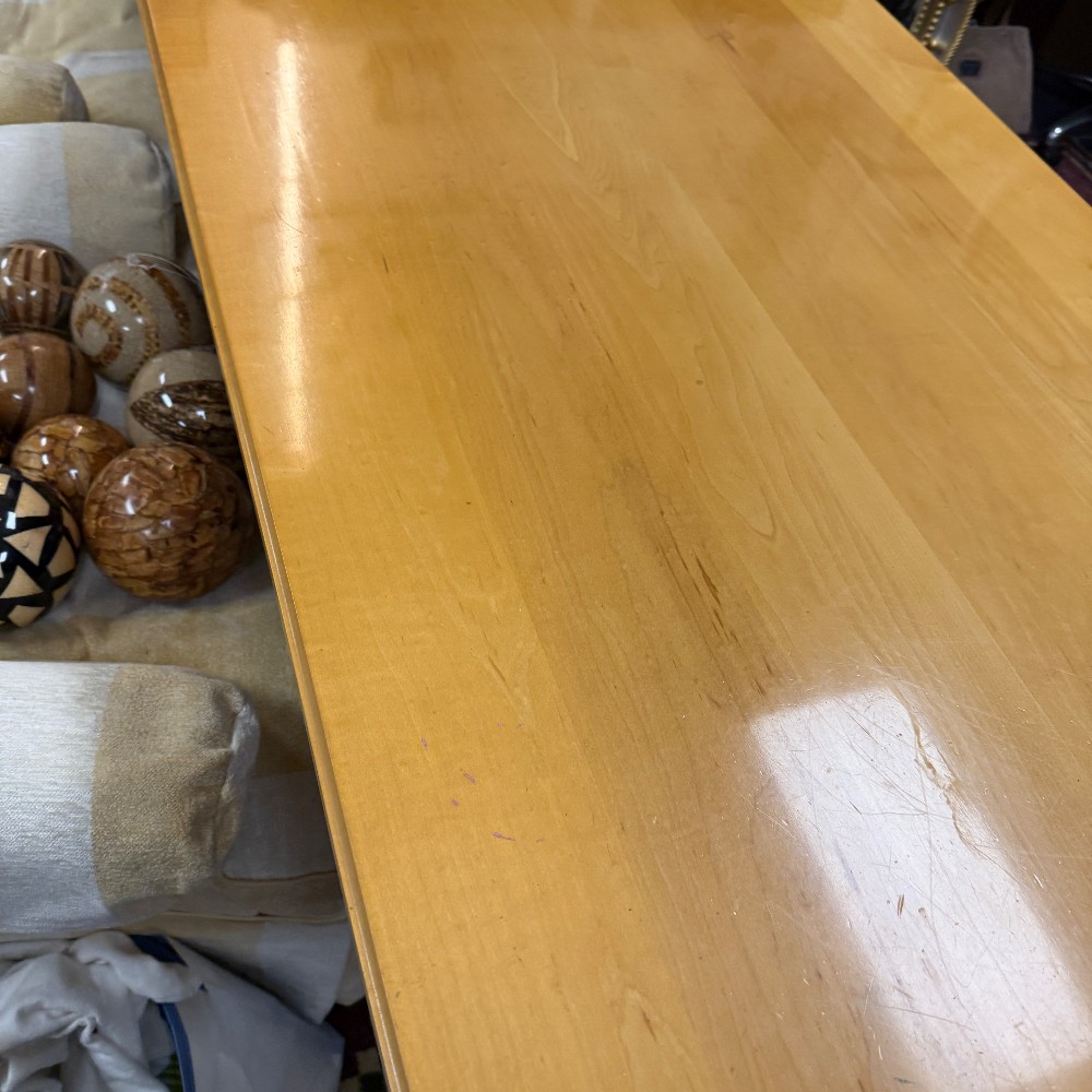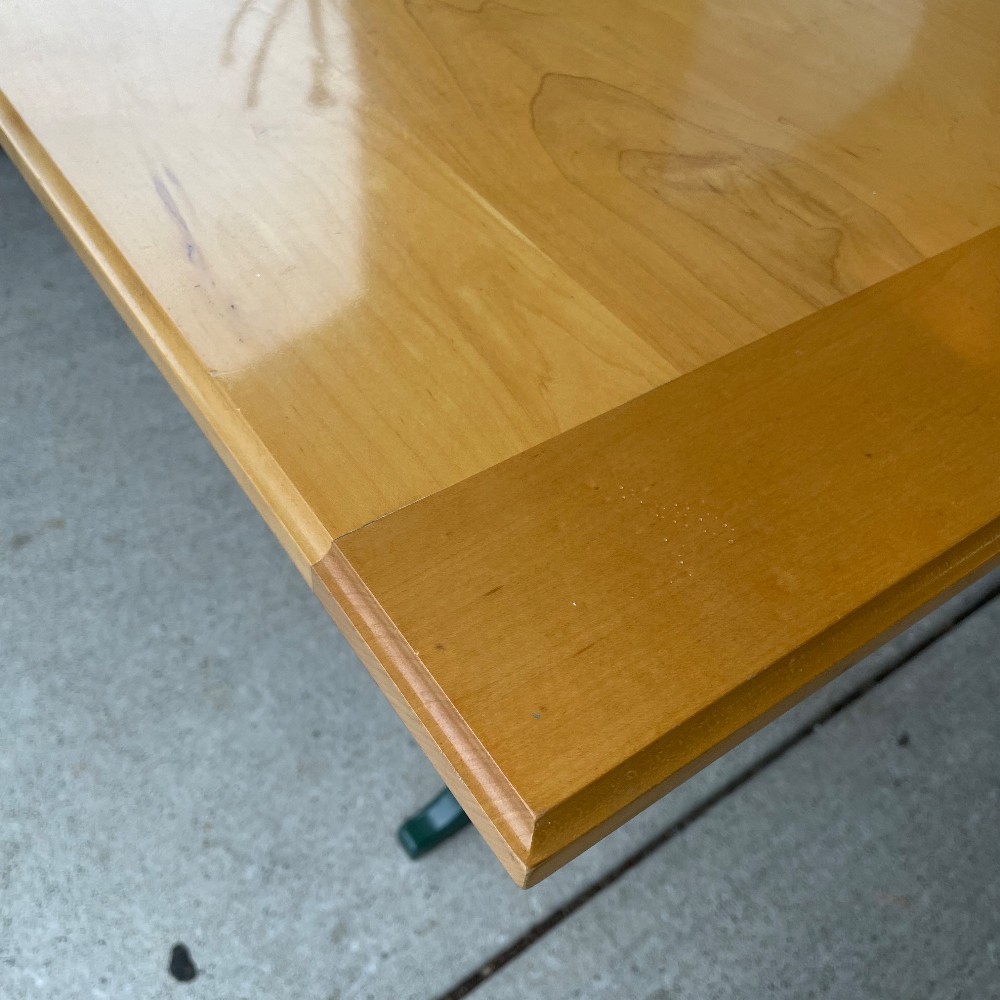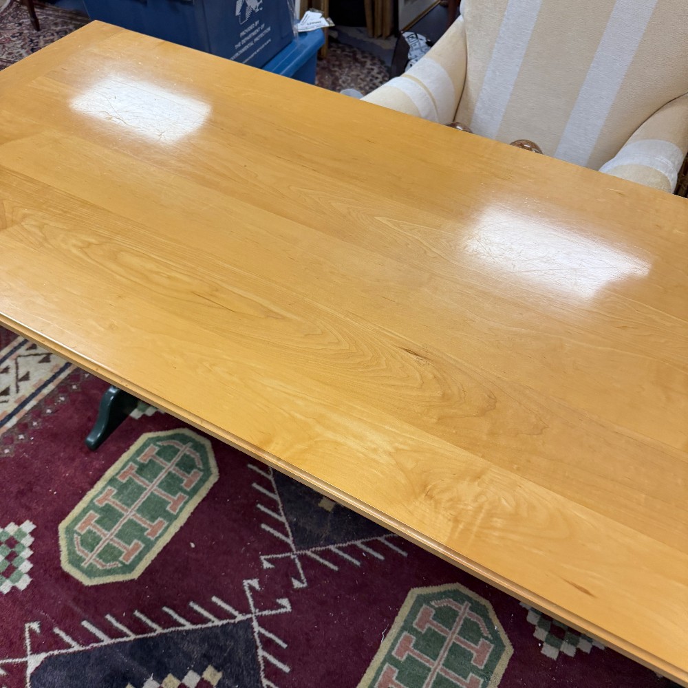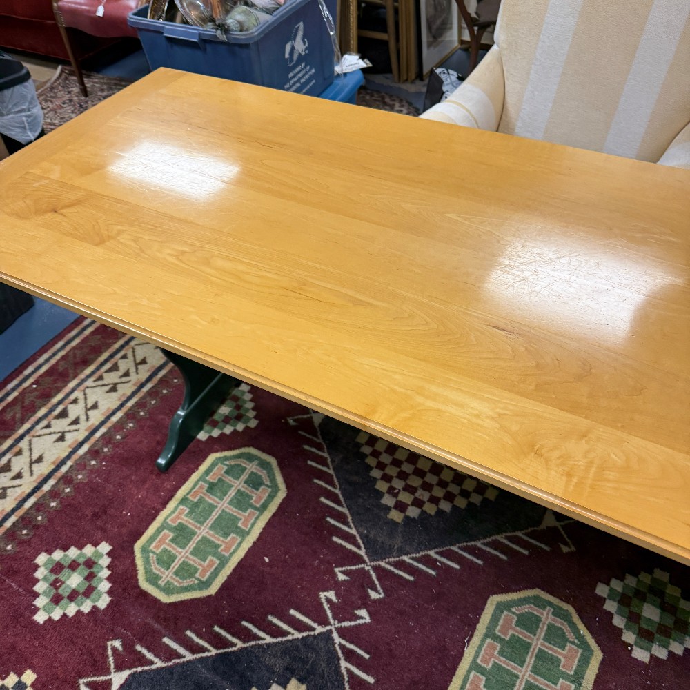 custom made, pine table with blonde top, green legs 29.75" w x 30" tall and 77" long