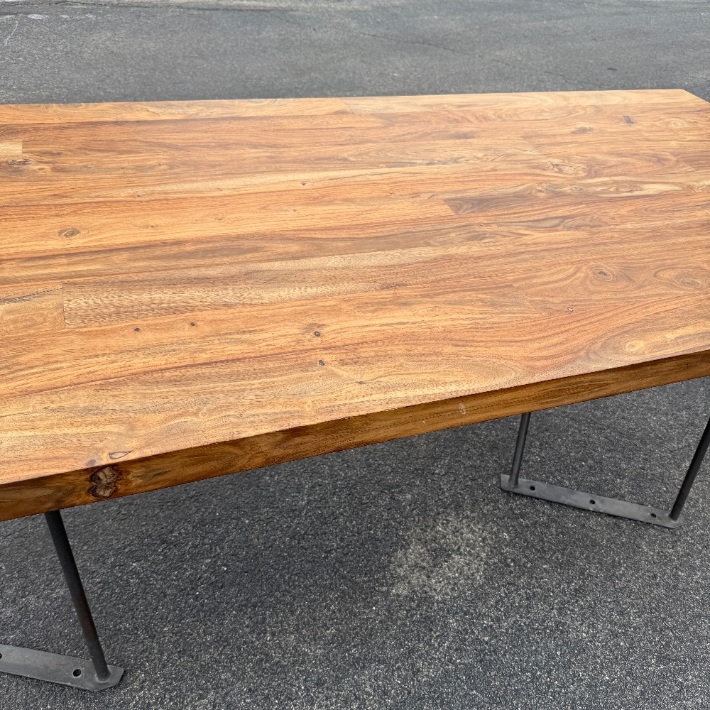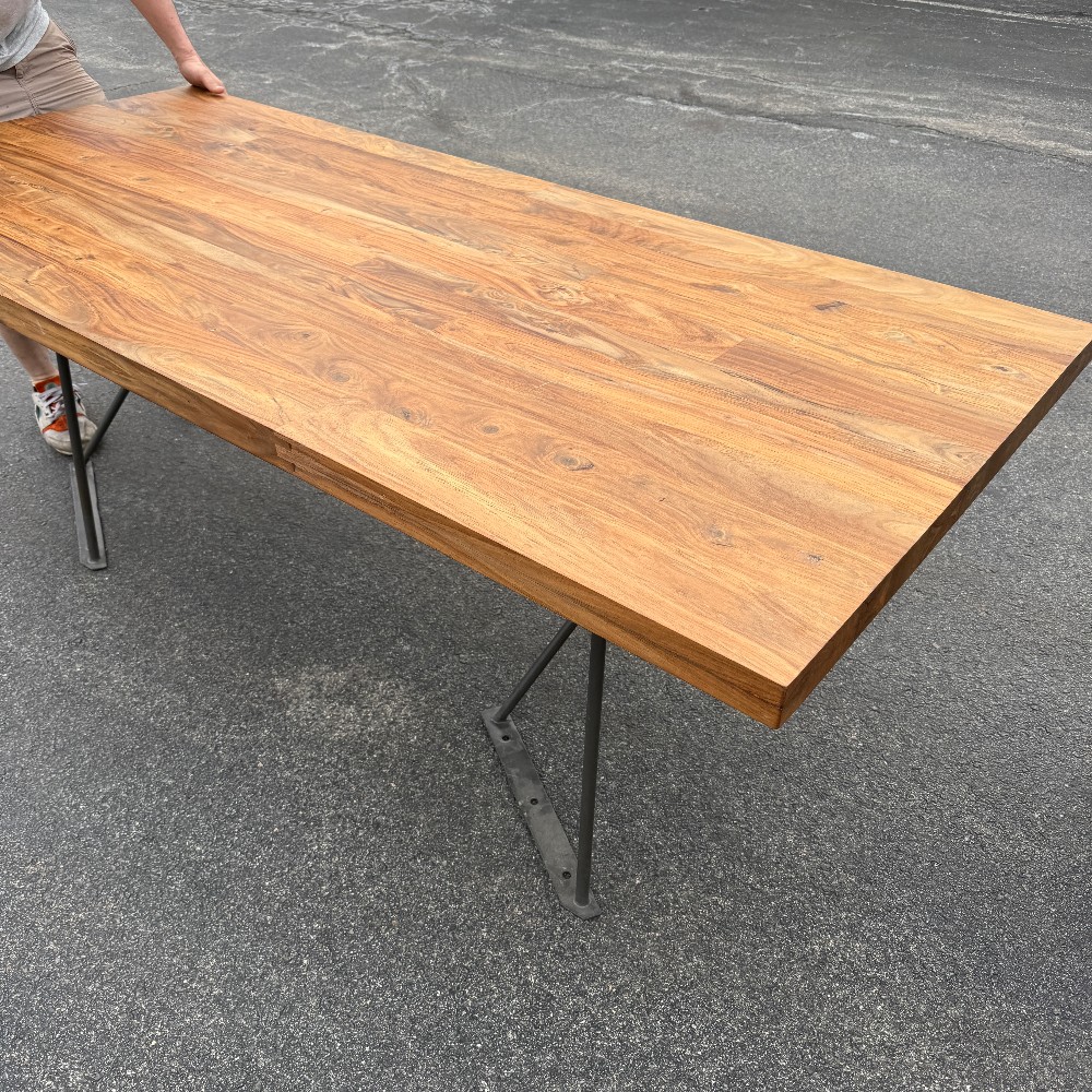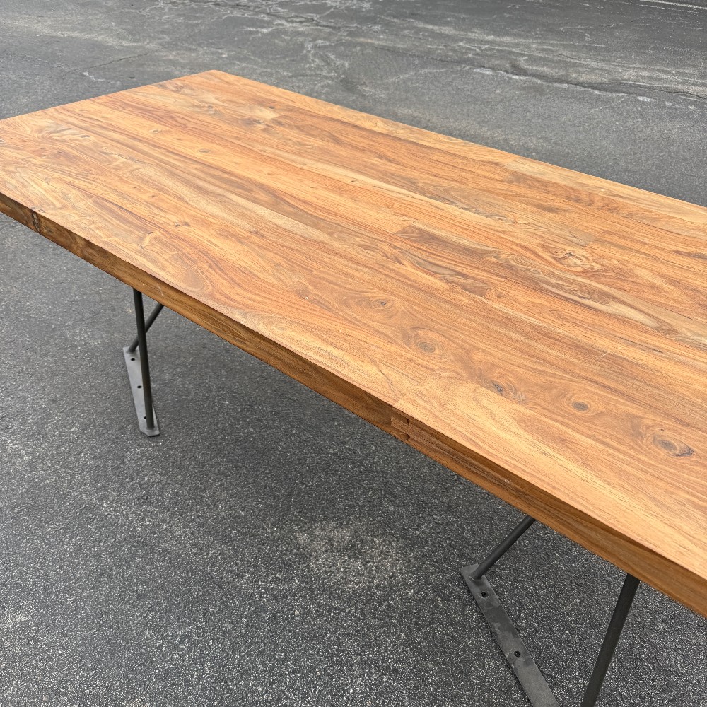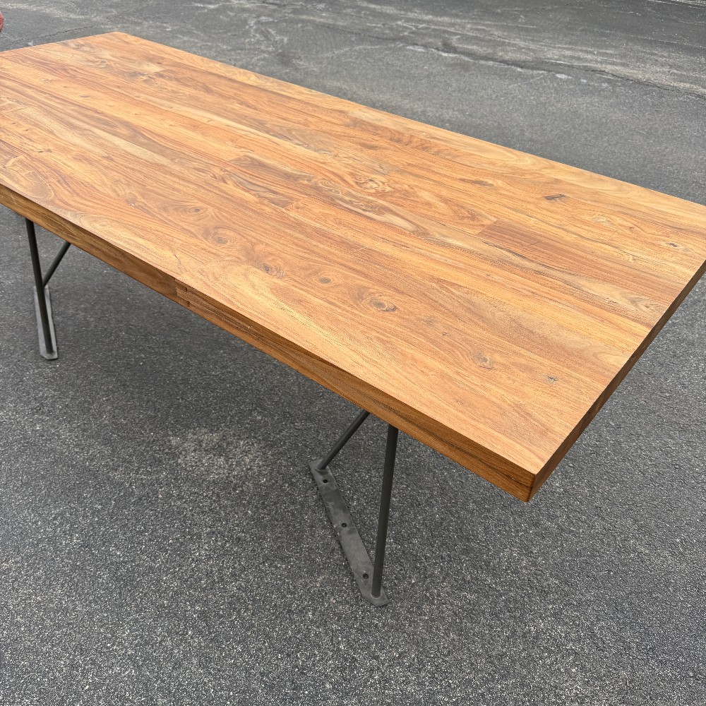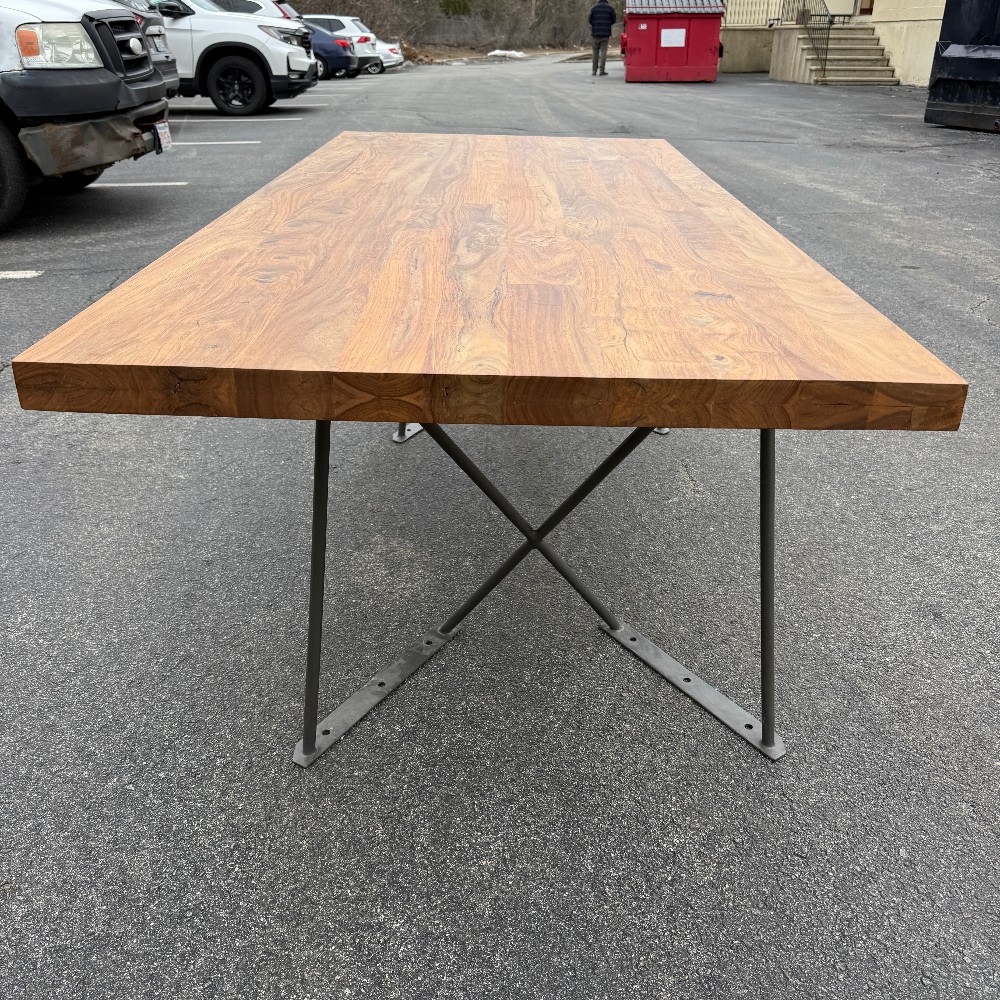 modern chrome base, 36" wide, 80" long, 29.5" tall and wood is 2" thick. picture here shows base upside down, angled (long chrome piece attaches to table bottom)