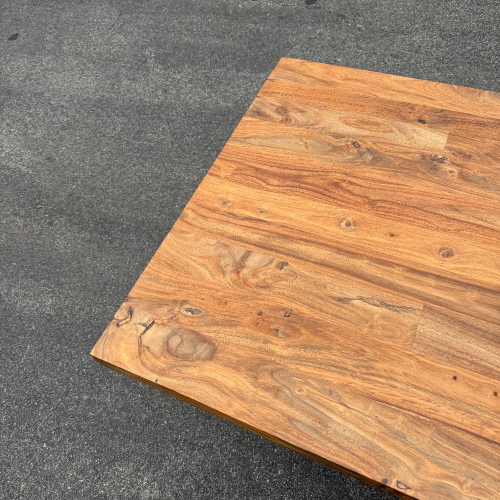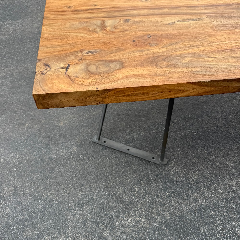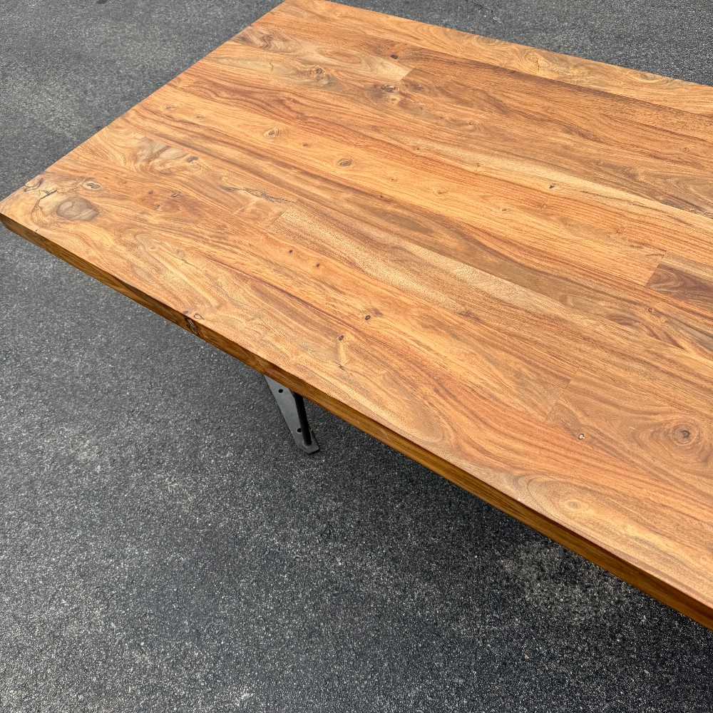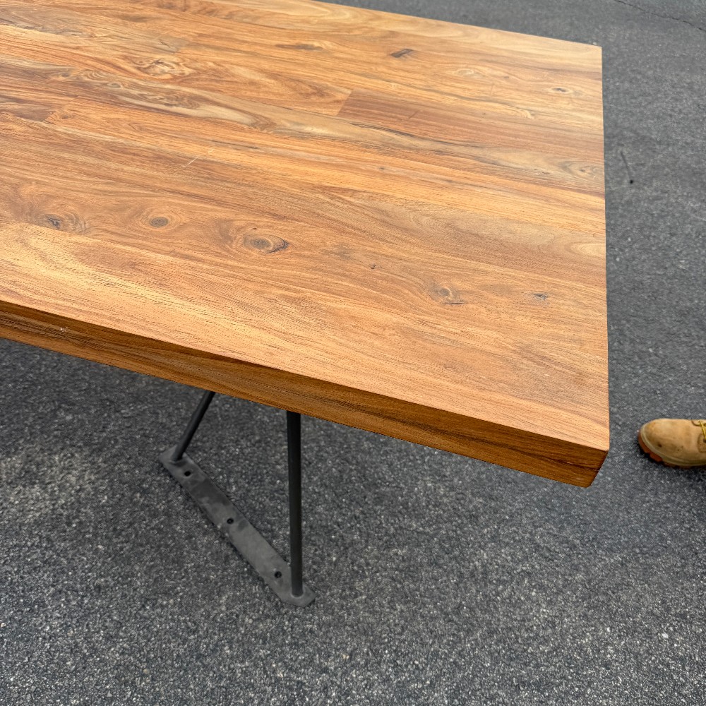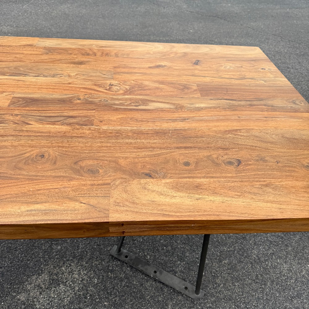 modern chrome base, 36" wide, 80" long, 29.5" tall and wood is 2" thick. picture here shows base upside down, angled (long chrome piece attaches to table bottom)