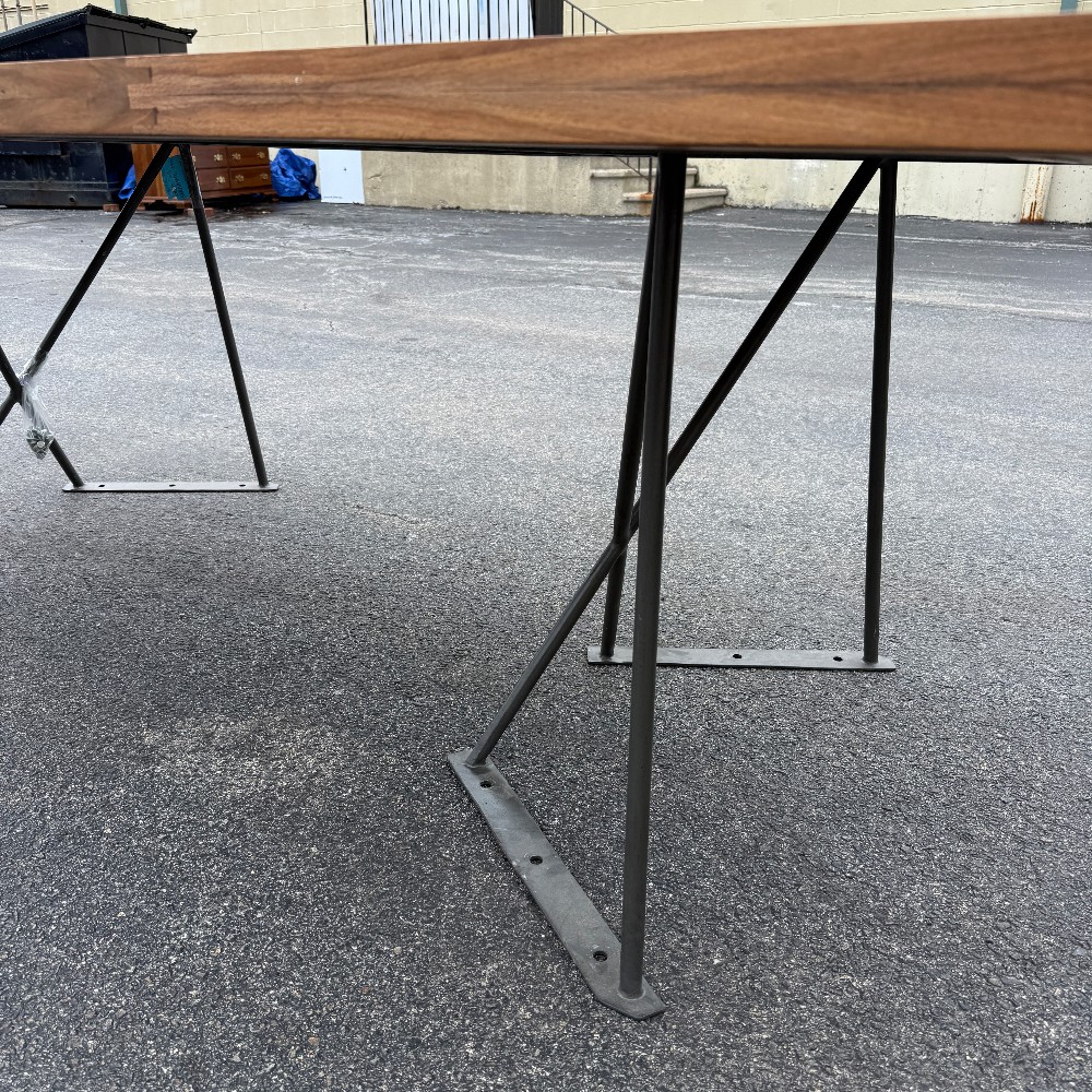 modern chrome base, 36" wide, 80" long, 29.5" tall and wood is 2" thick. picture here shows base upside down, angled