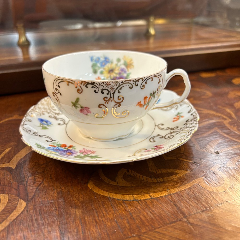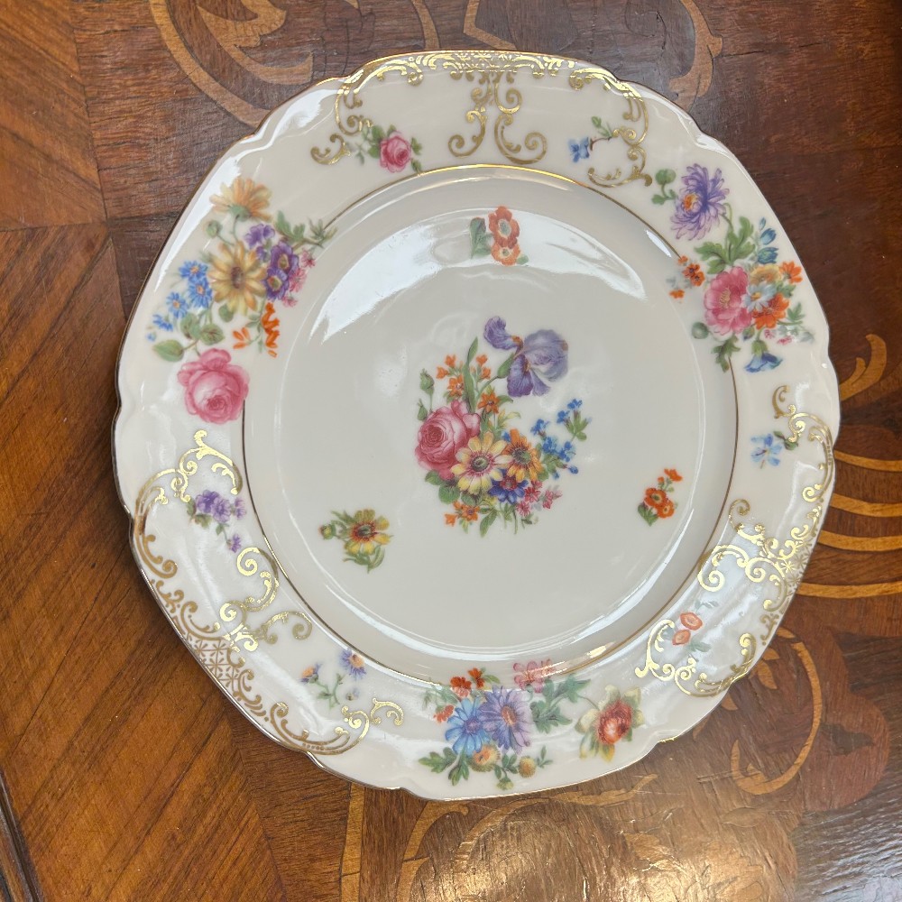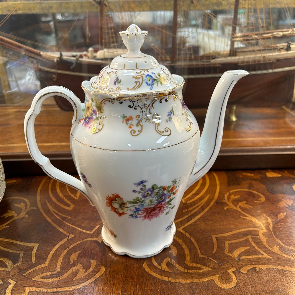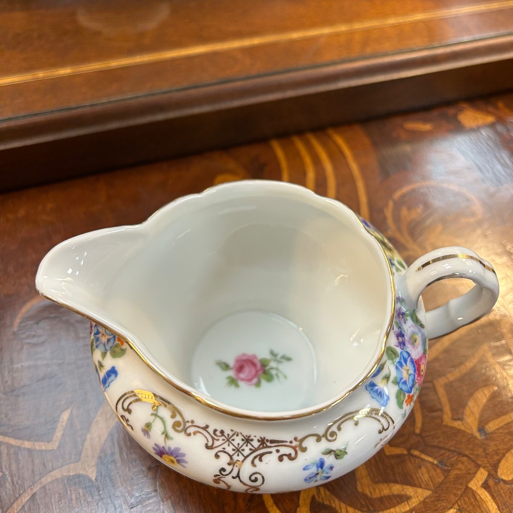 some extras, cup h. 2 1/4, D. 3 1/2", saucer D. 3 1/2", creamer h. 3 1/4", desert plate D. 7 1/2", tea pot h. 10"