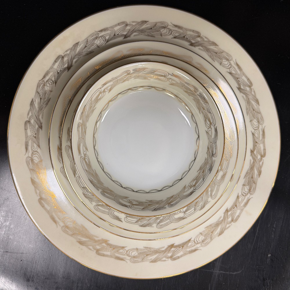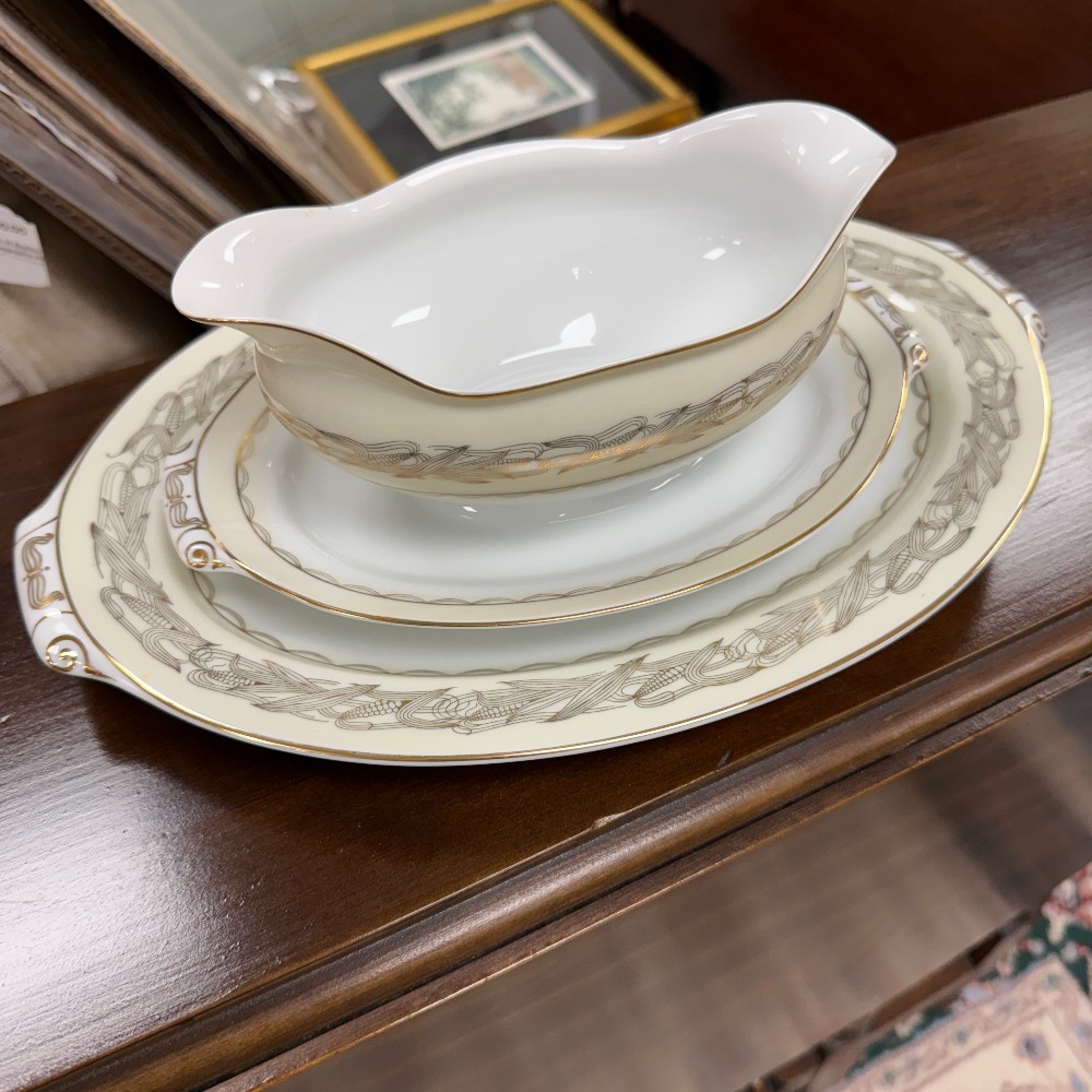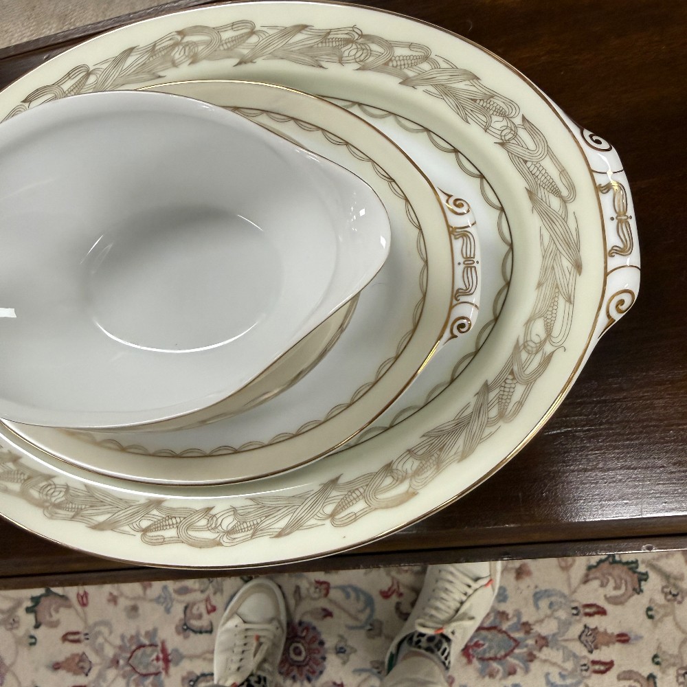 11 dinner plates, 10.5" D, 12 soup, 11 salad, 8 cups / saucers, 12 finger, gravy, sugar, creamer, platters (2) tureen (chipped)