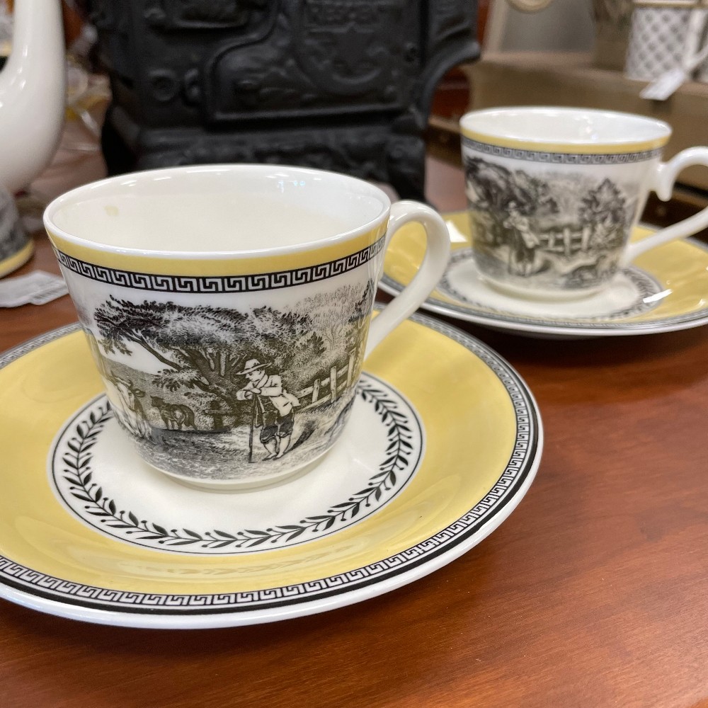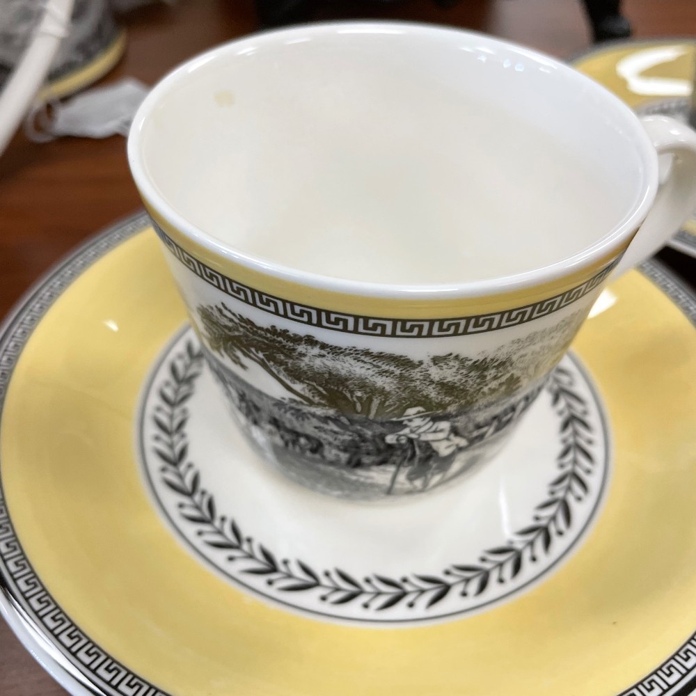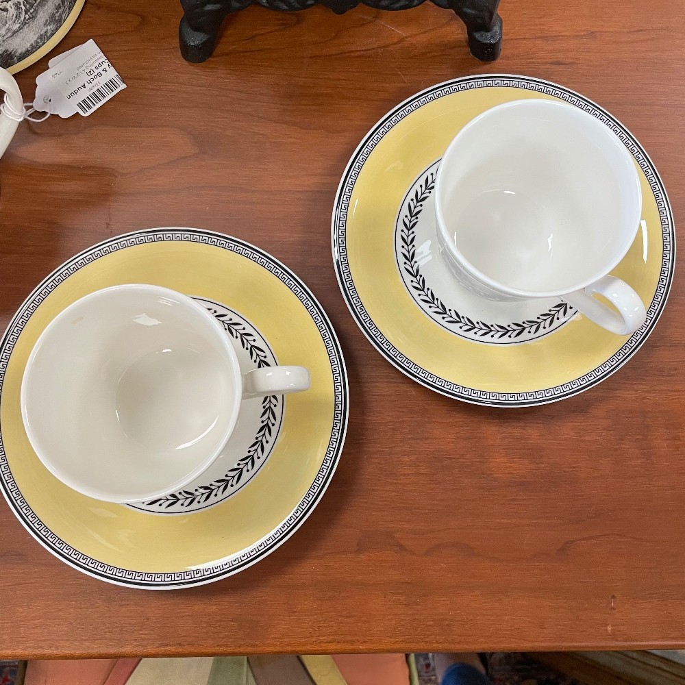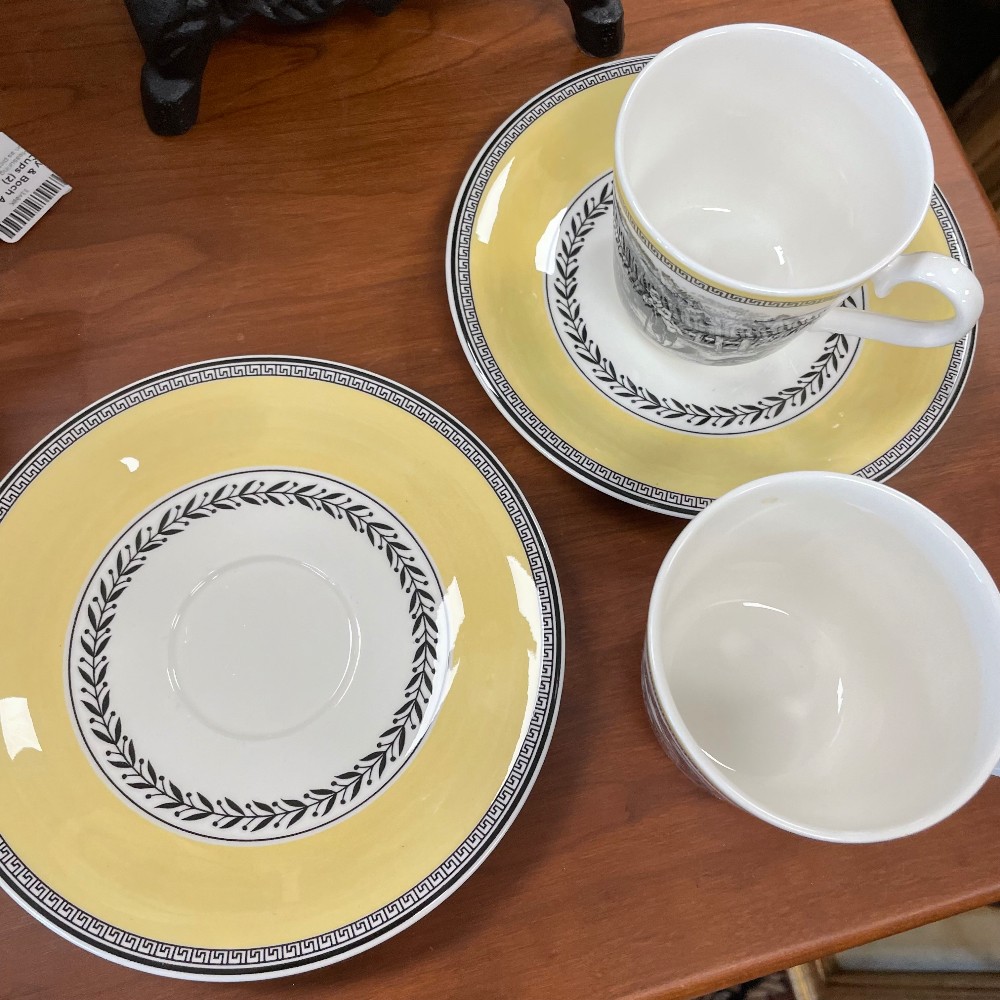 Yellow, white & black. Measuring 2 3/4"T x 4 1/4" x 3 1/4"W. Saucer 6 1/4". Condition as pictured