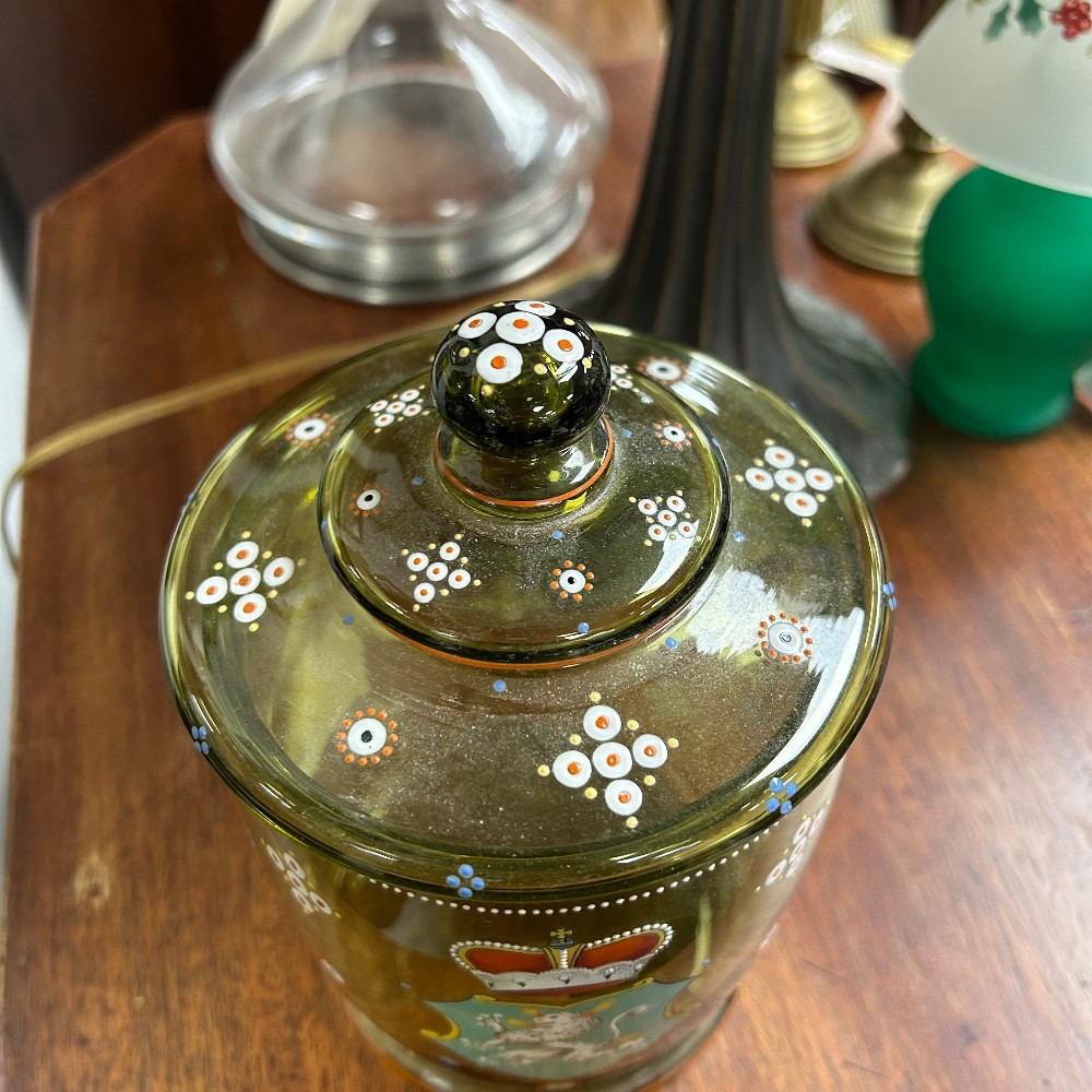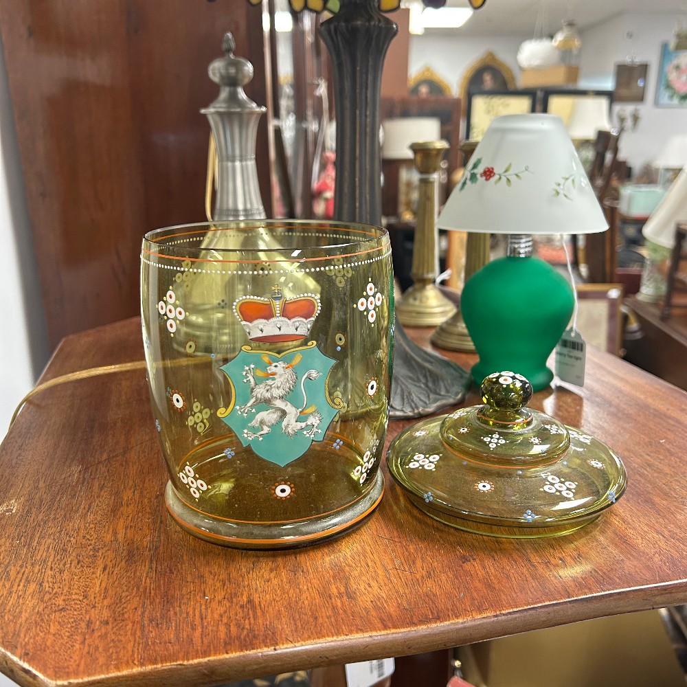 handpainted with coat of arm, h. 8 1/2", diameter 4 1/2"