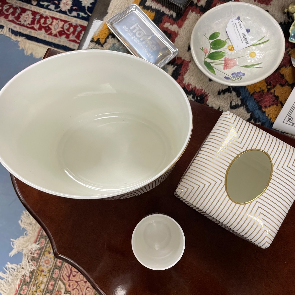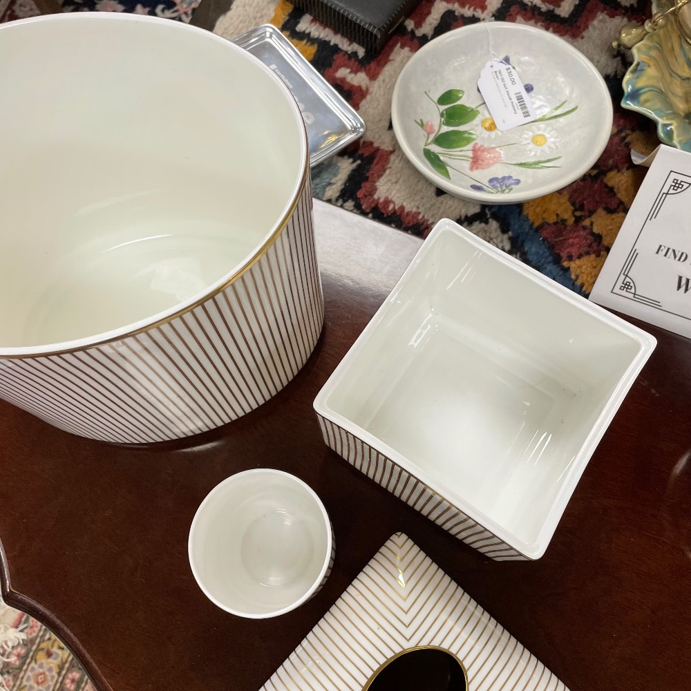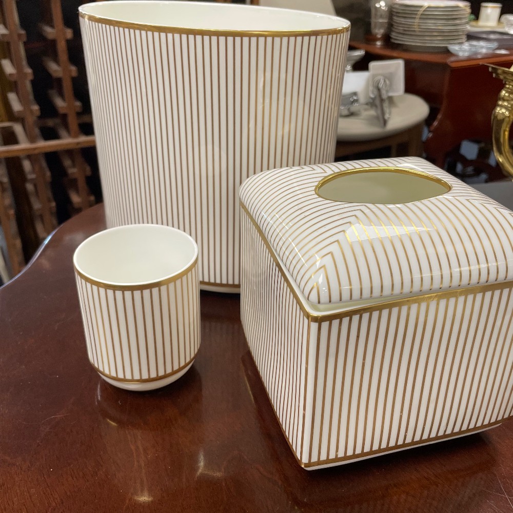 By Anali. Gold and White. Wastebasket, tissue box, toothbrush holder. Condition as pictured.