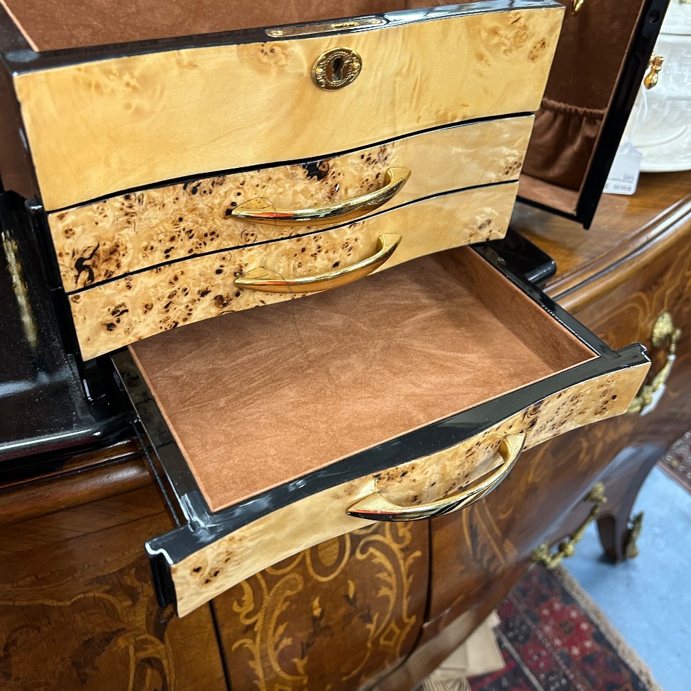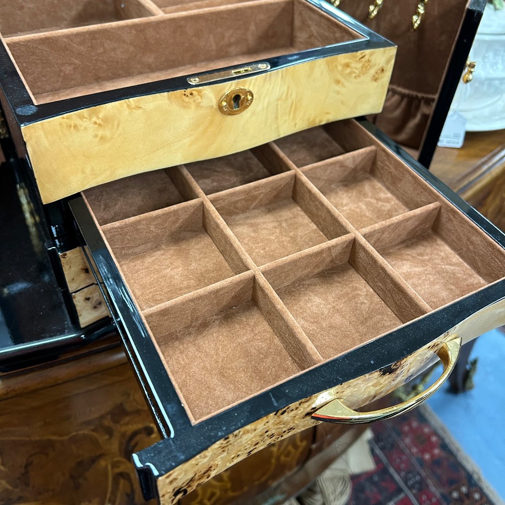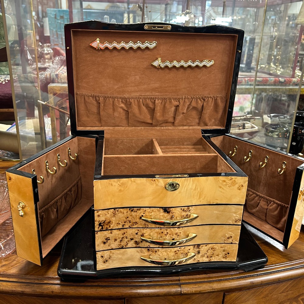 Measuring 14 3/4"W x 9 1/2"D x 9" 1/4"T. Multiple containers and necklace hooks