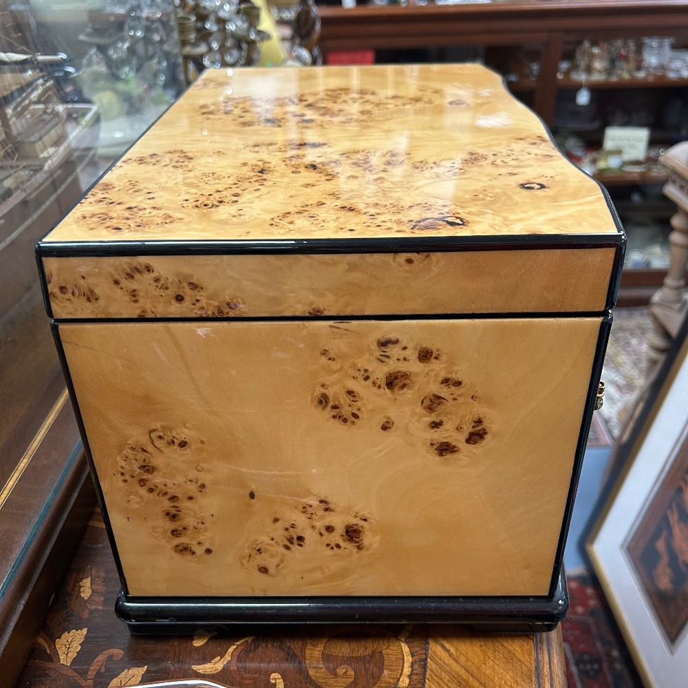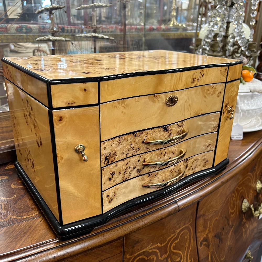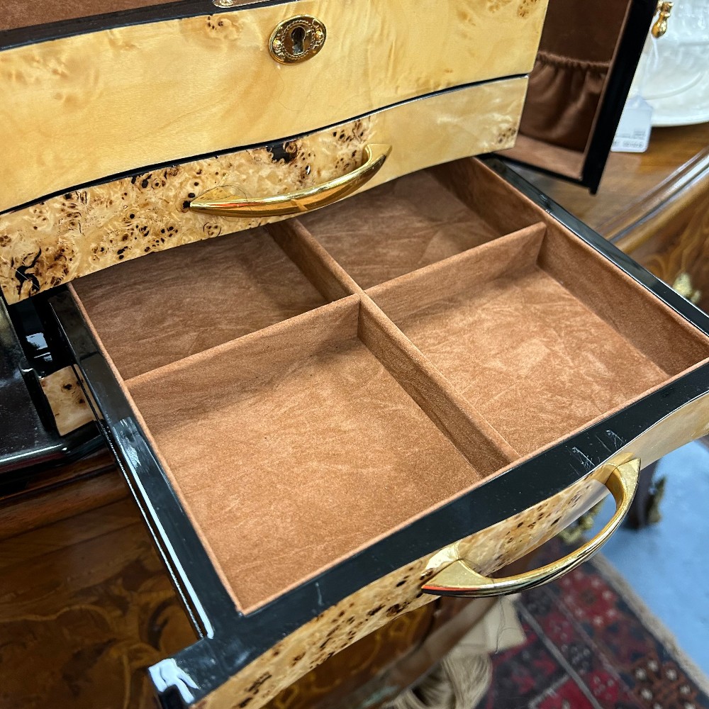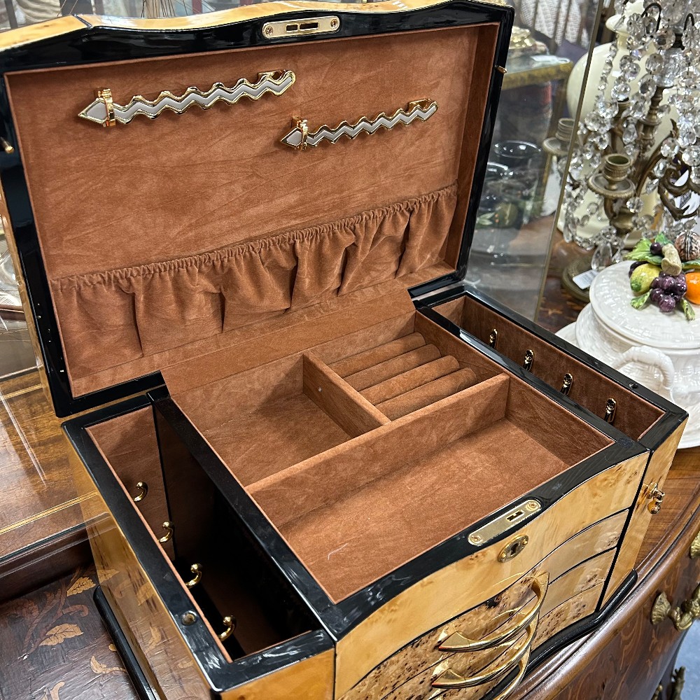 Measuring 14 3/4"W x 9 1/2"D x 9" 1/4"T. Multiple containers and necklace hooks