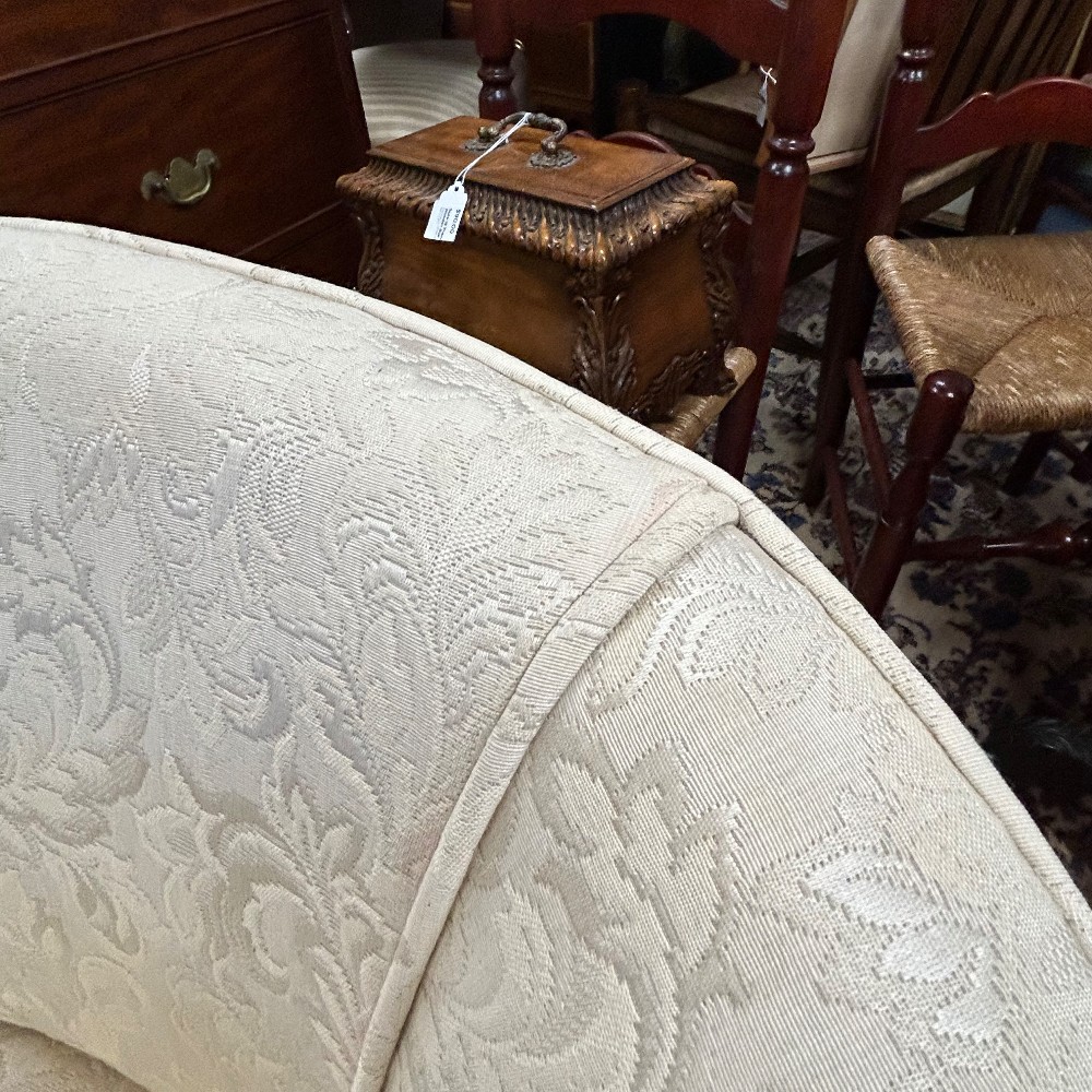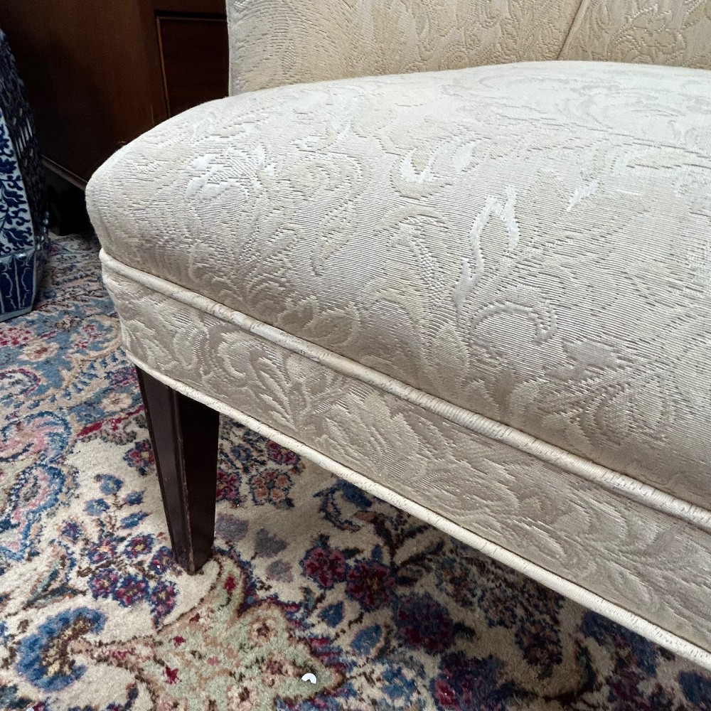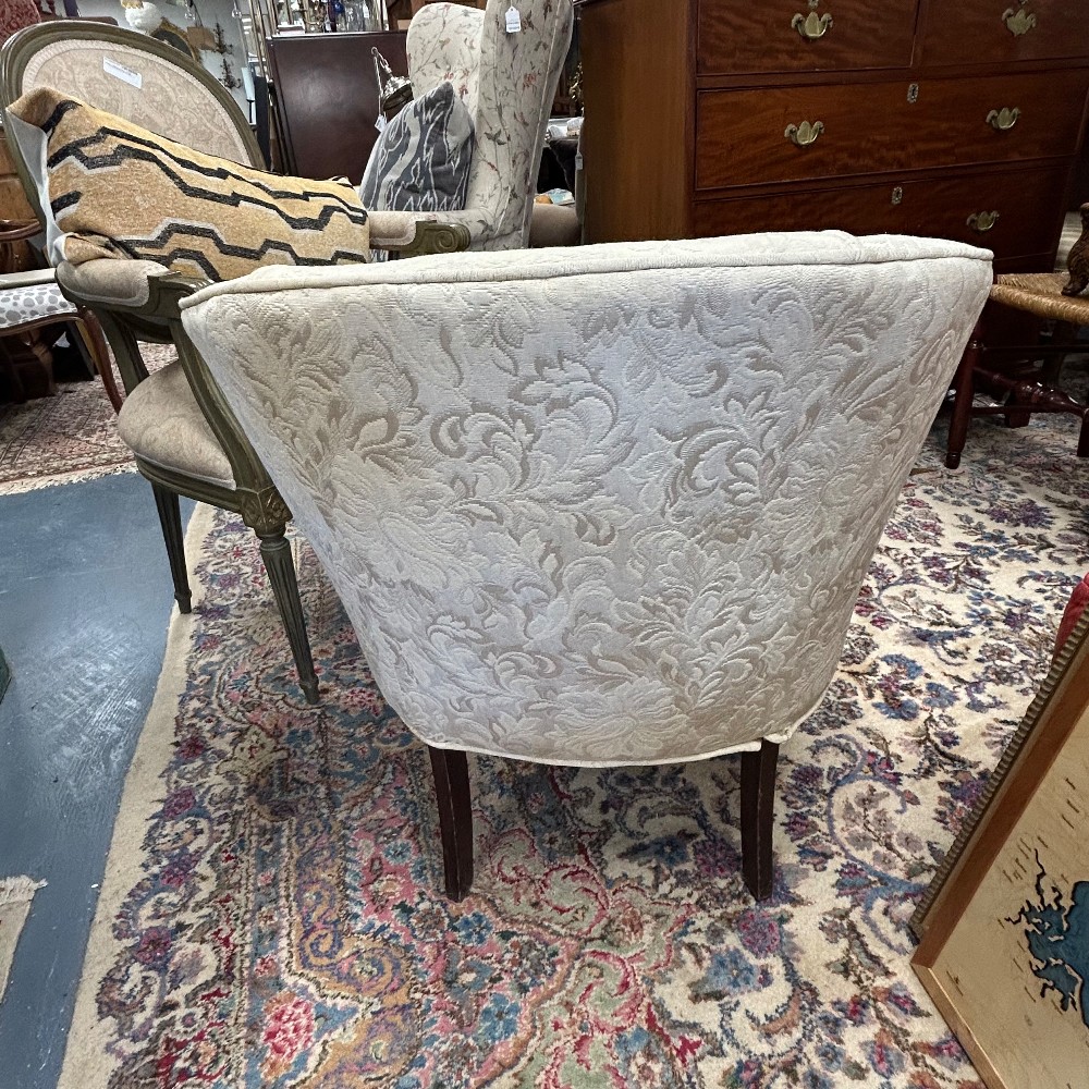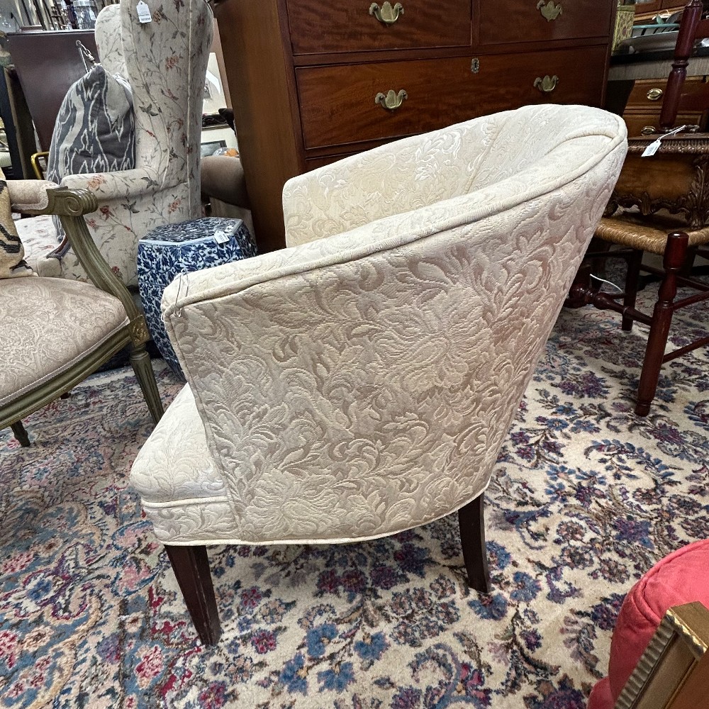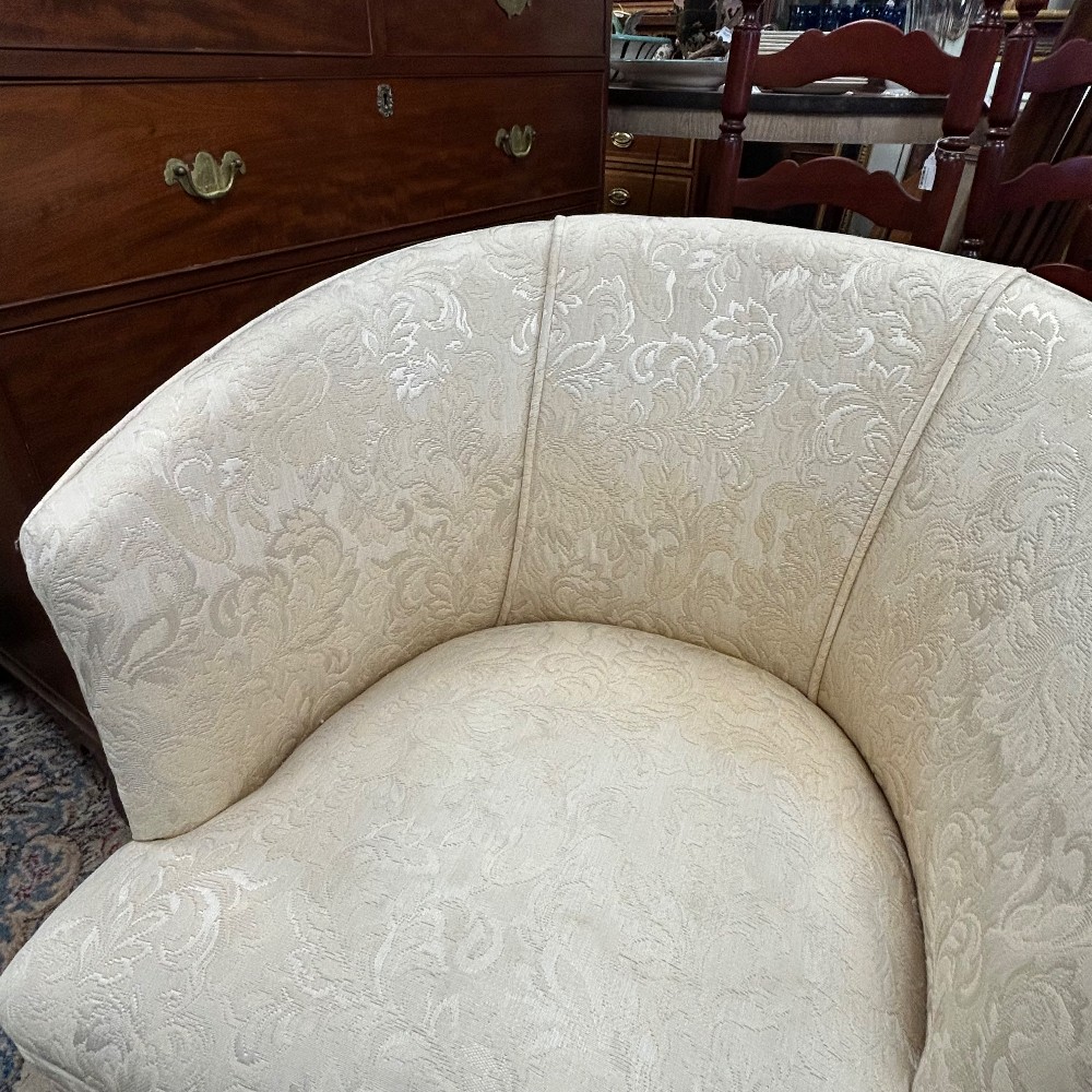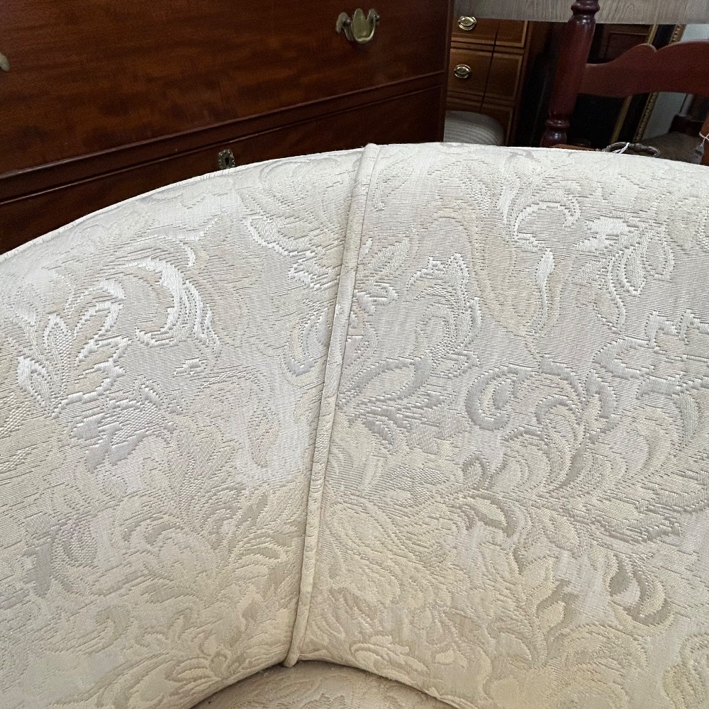 Cream fabric, wooden legs. Measuring 29 1/2"T x approx 25"W x 21"D