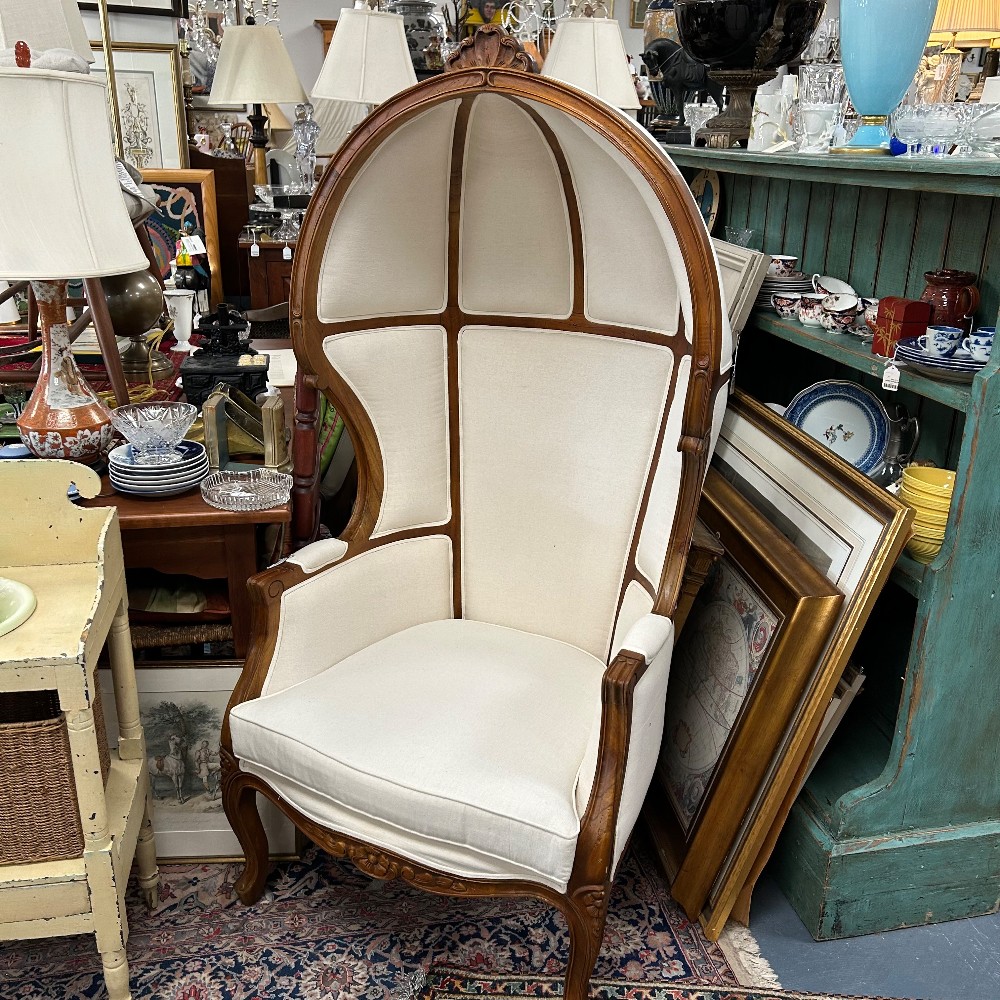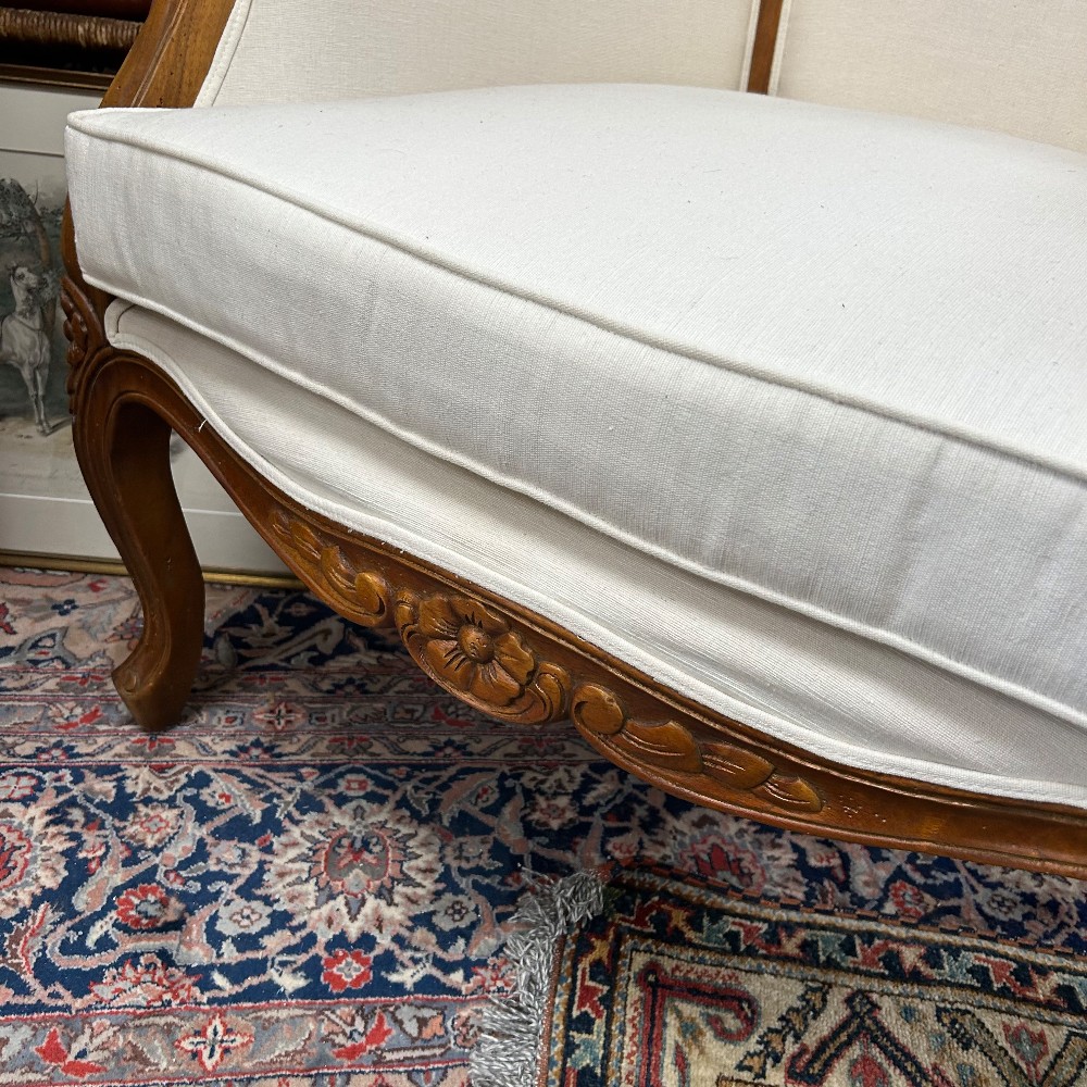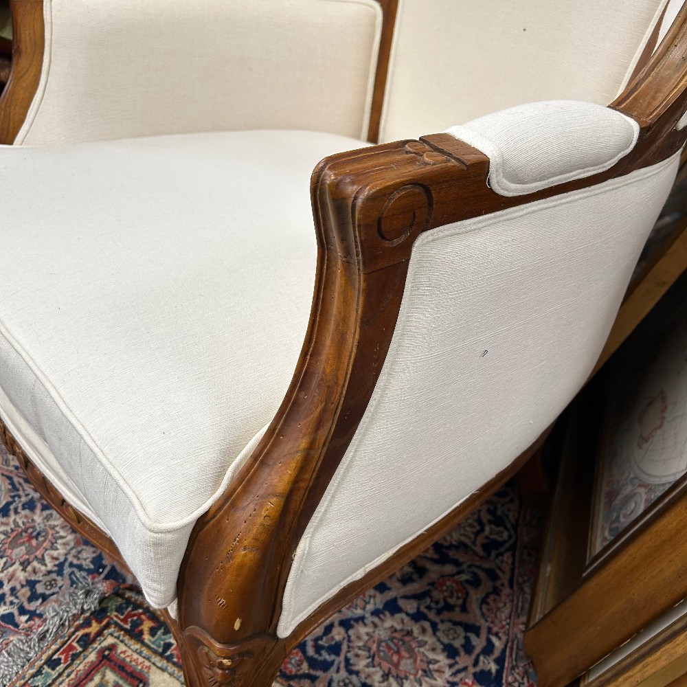 Wood frame, white fabric. Measuring 64"T x 30"W x 25"D x 18.5" seat height, 26" arm height