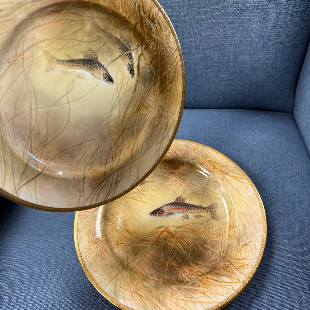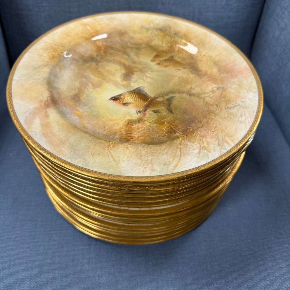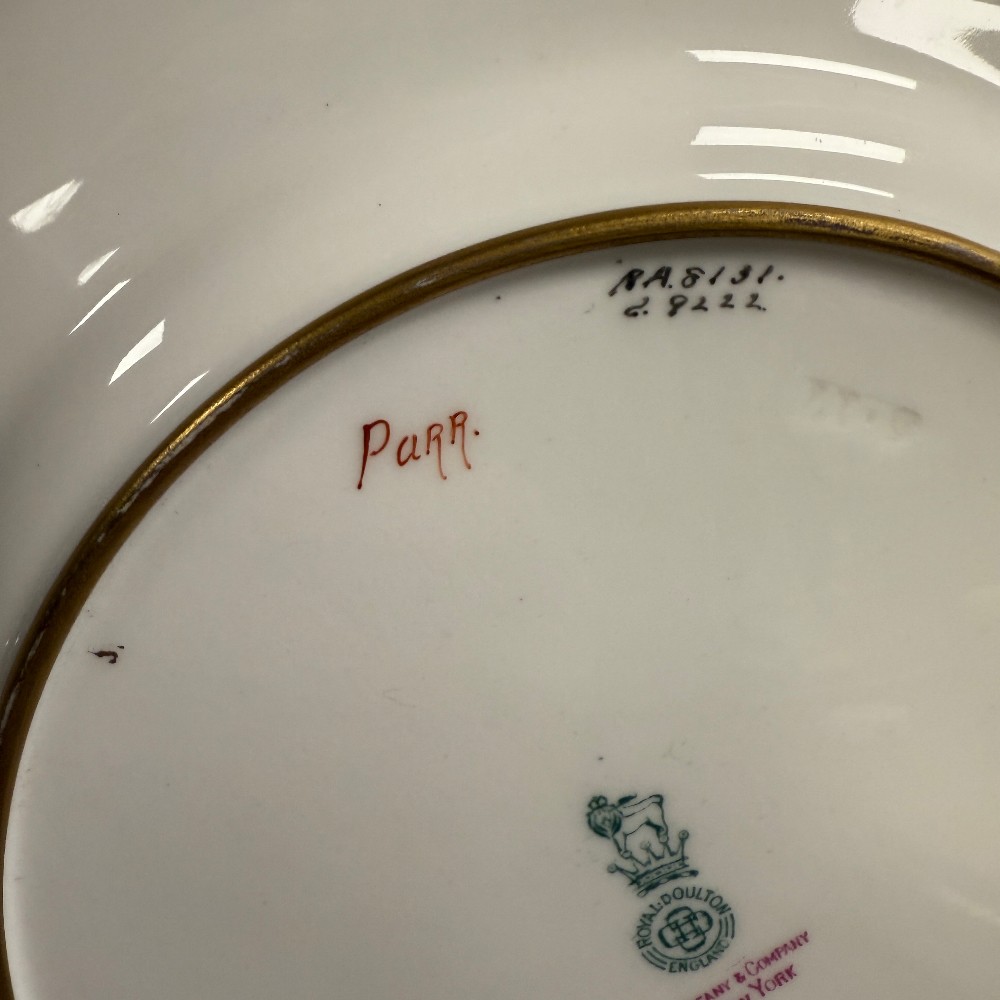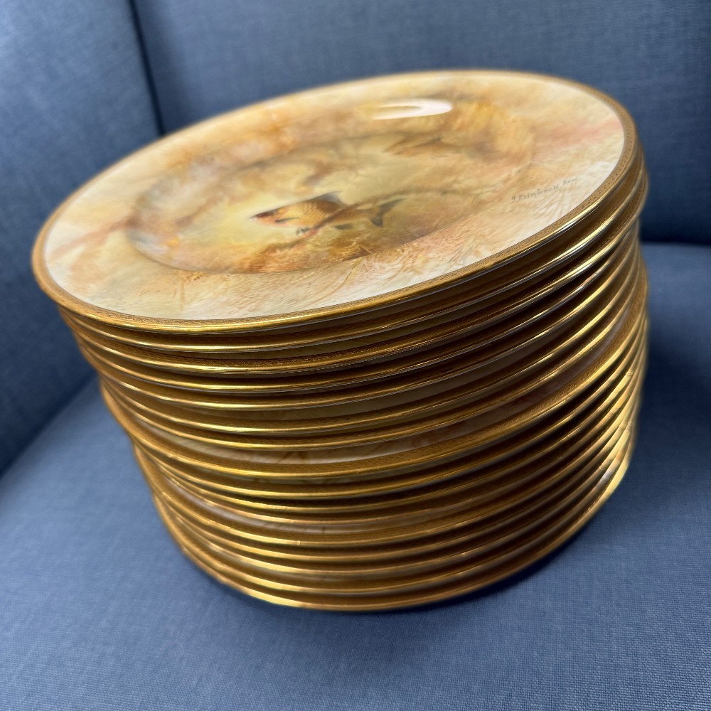 hand painted, signed, incredible collection of 16. Each measuring 9.5" D with gold edging.