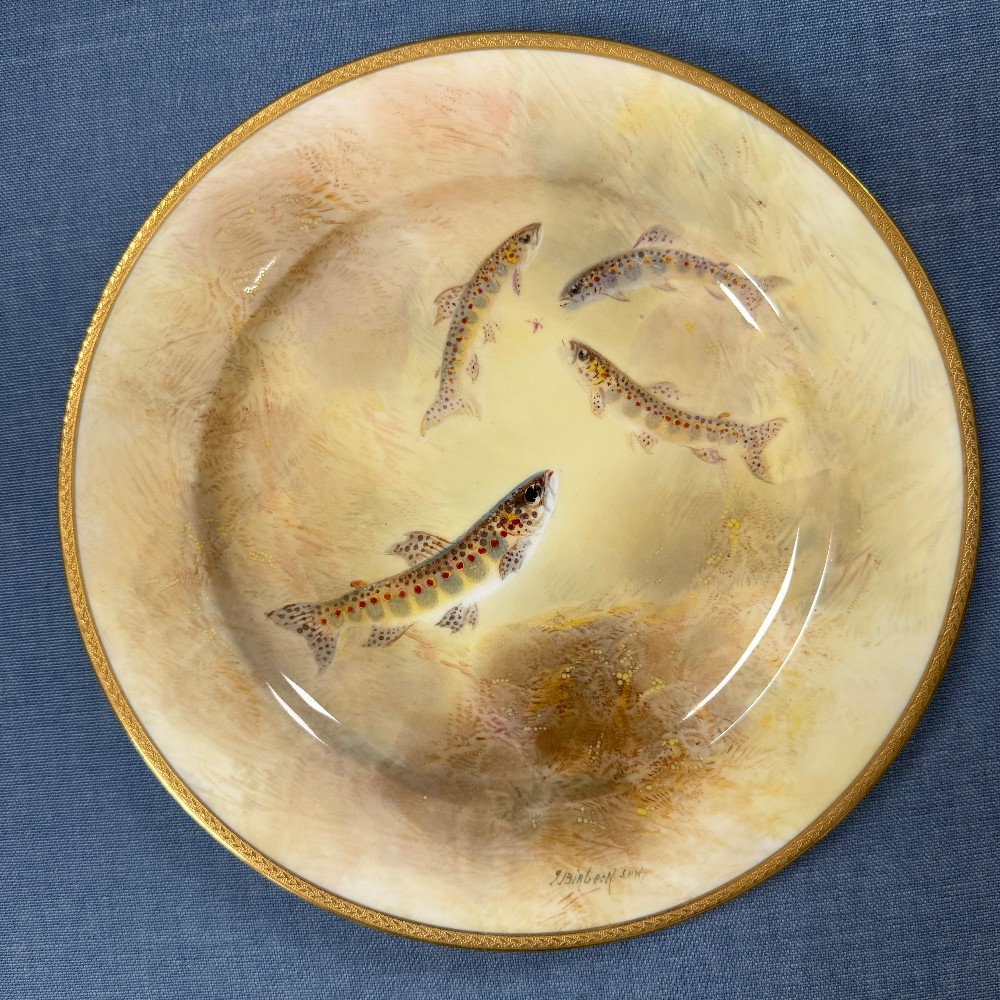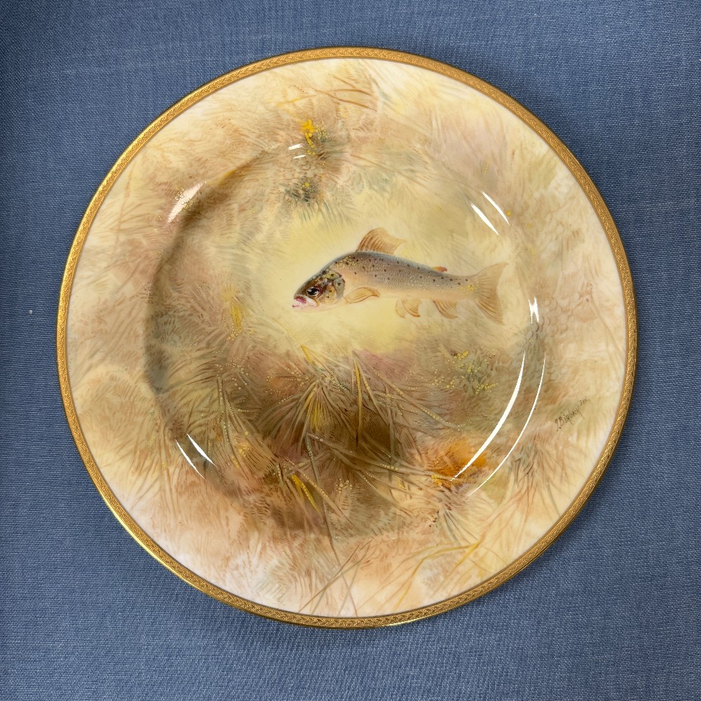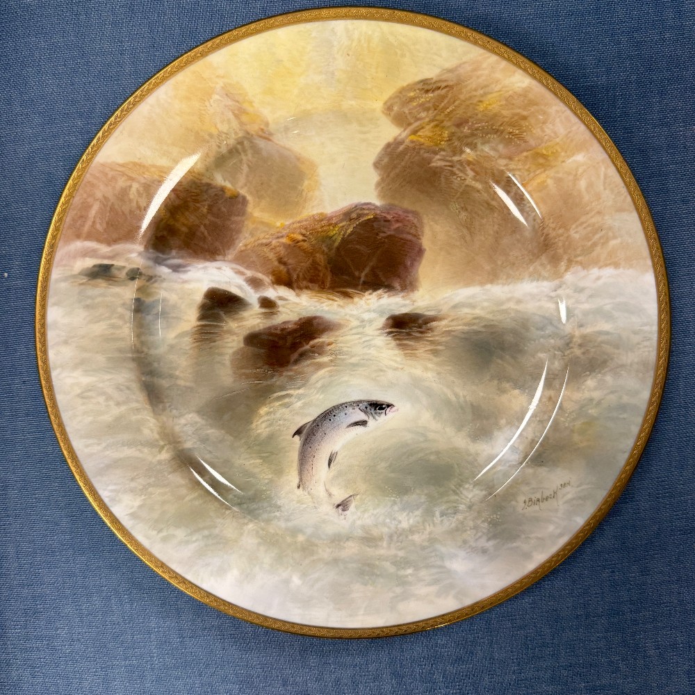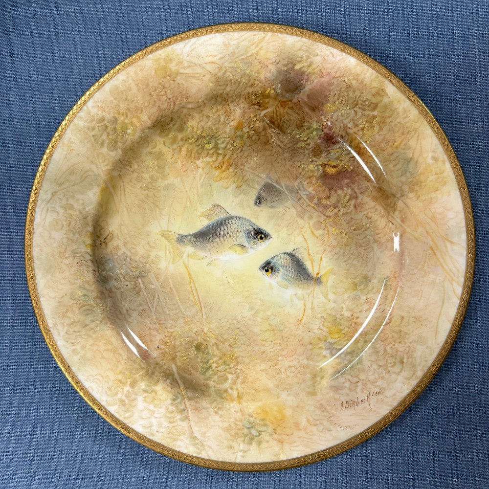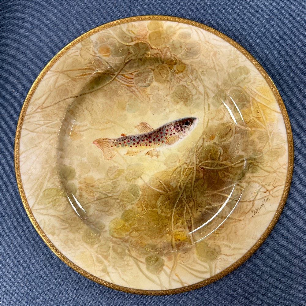 hand painted, signed, incredible collection of 16. Each measuring 9.5" D with gold edging.