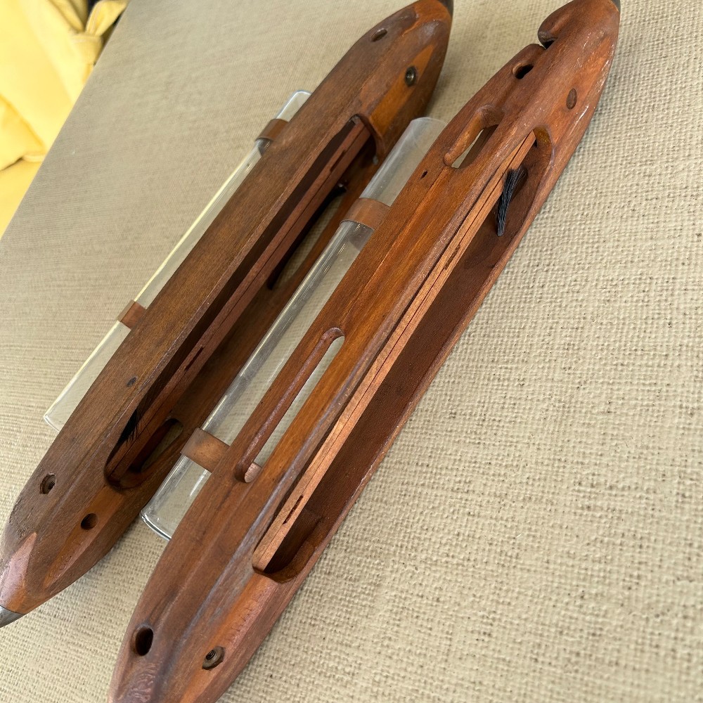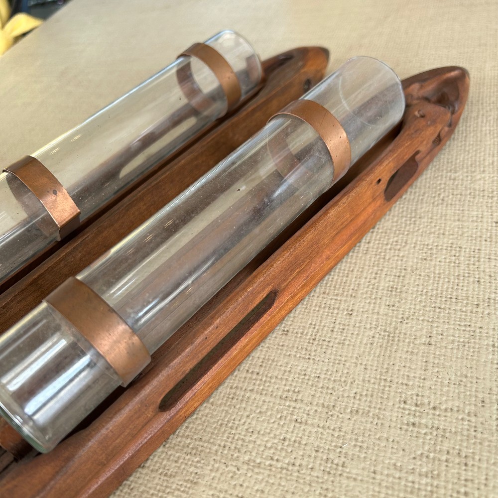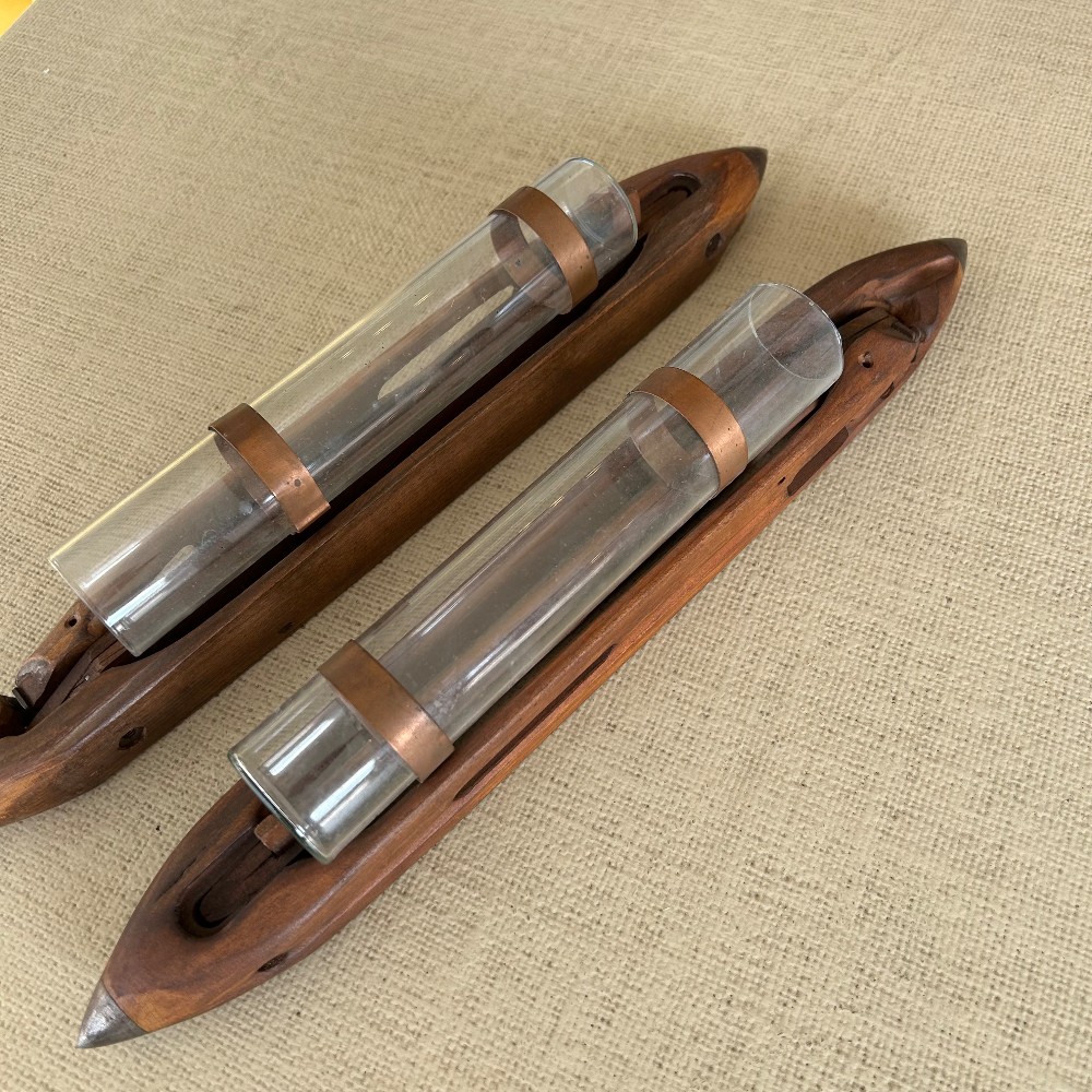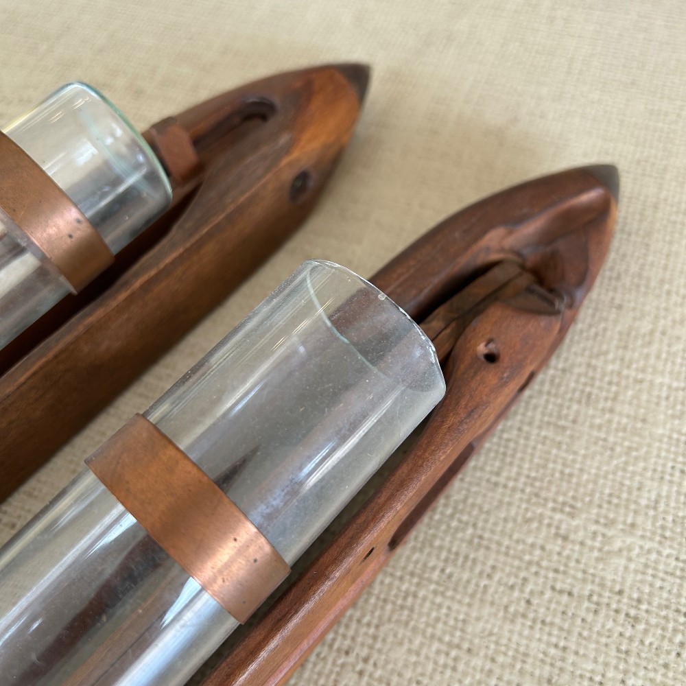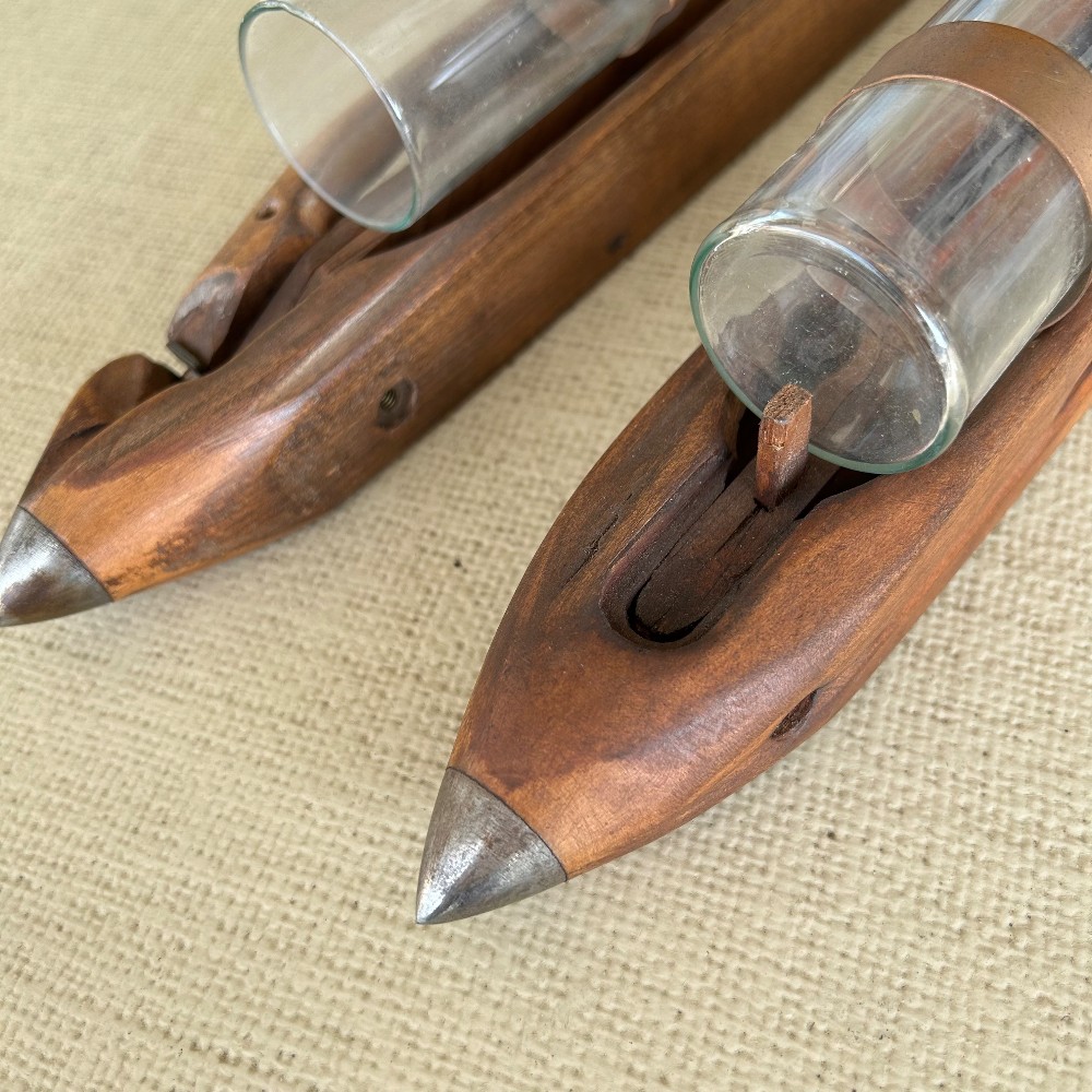 Repurposed weaving shuttles w/ glass cylinders. Measuring 16"L x 2"W x 3"D. Condition as pictured